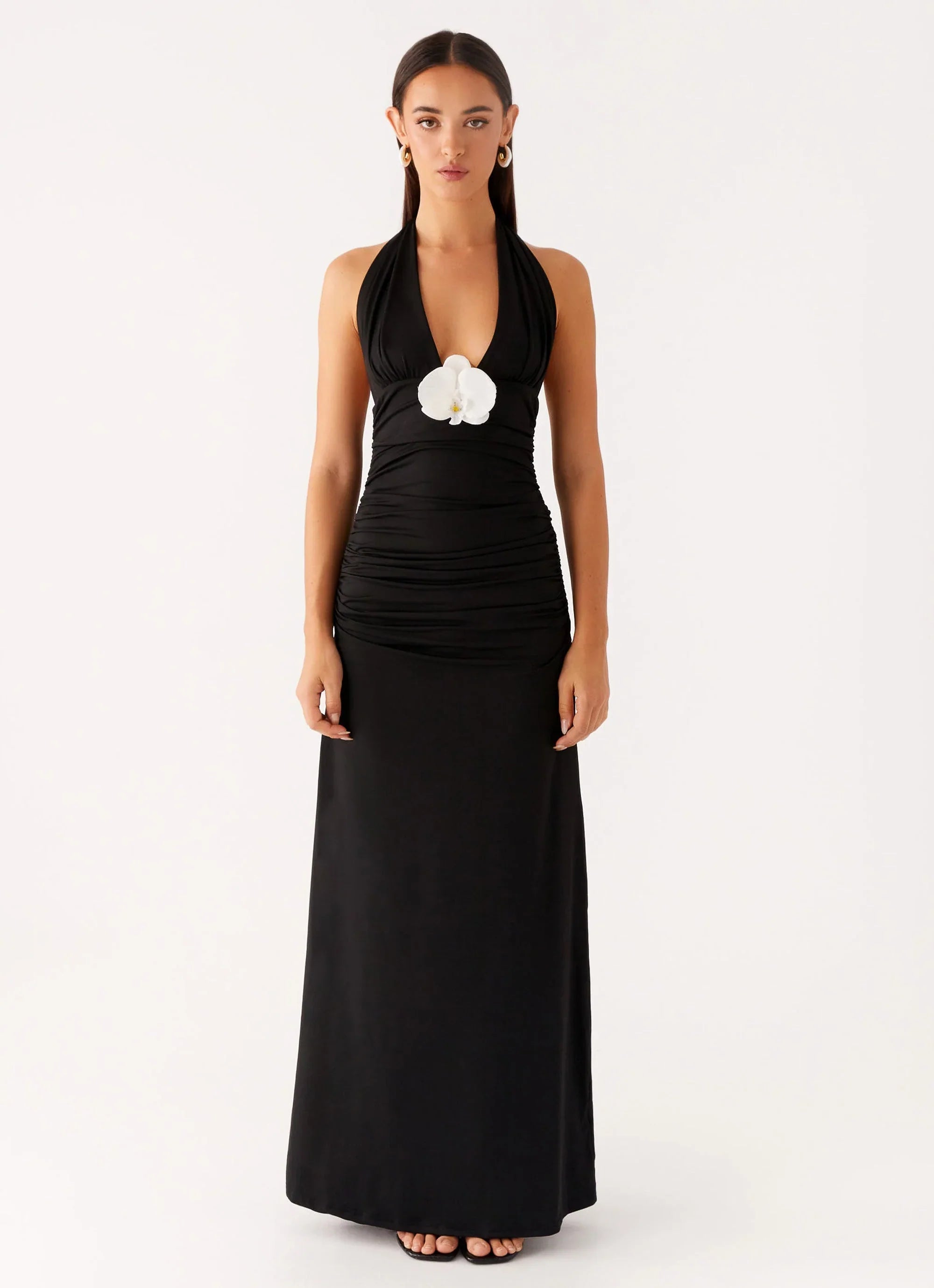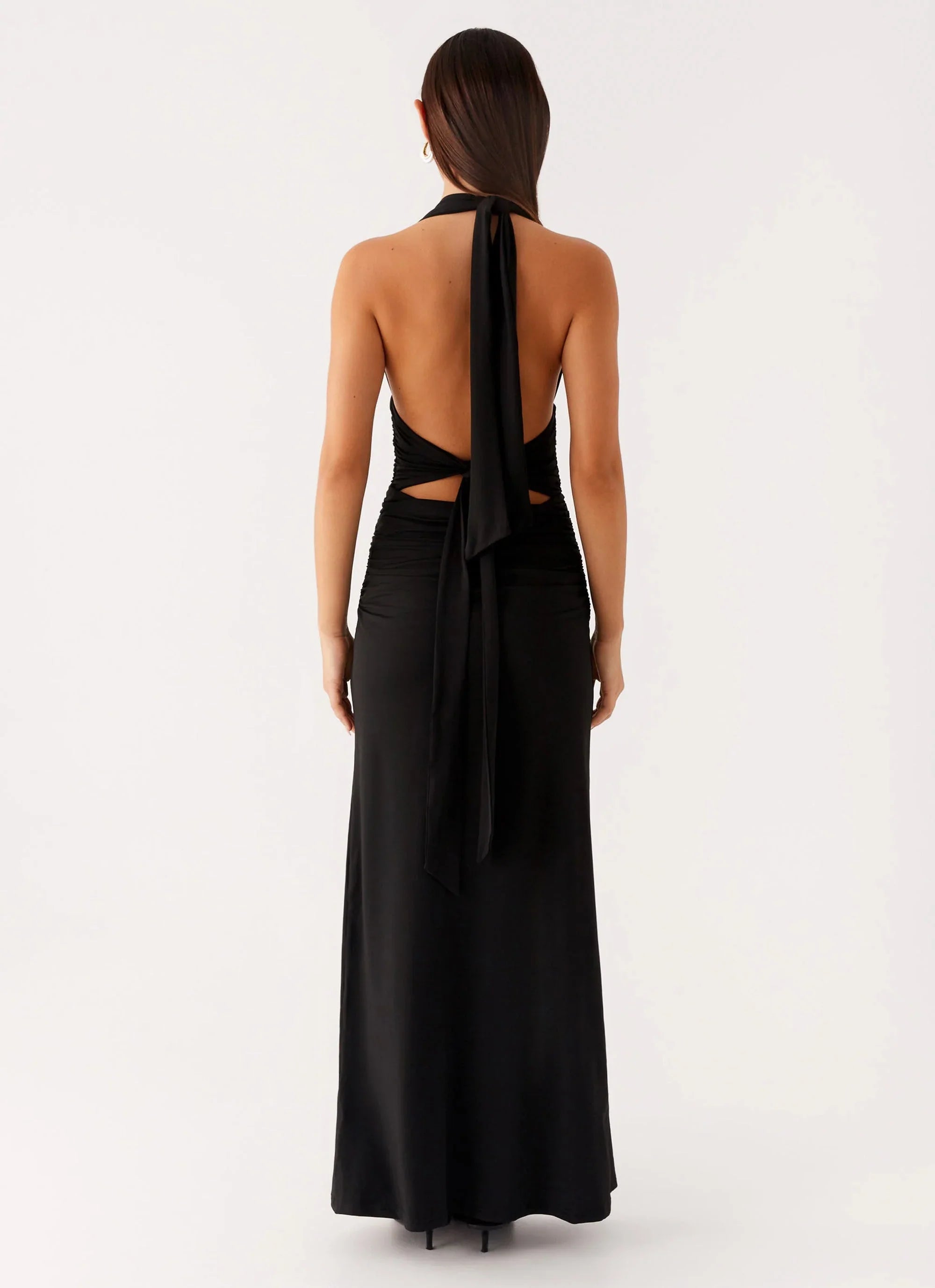 Sleek, seductive, and made to shine — the Adalie Halter Neck Midi Dress in Black brings the heat. With a halter V neckline, ruched sides, and an open back, this midi is your go-to for a night that’s anything but ordinary.