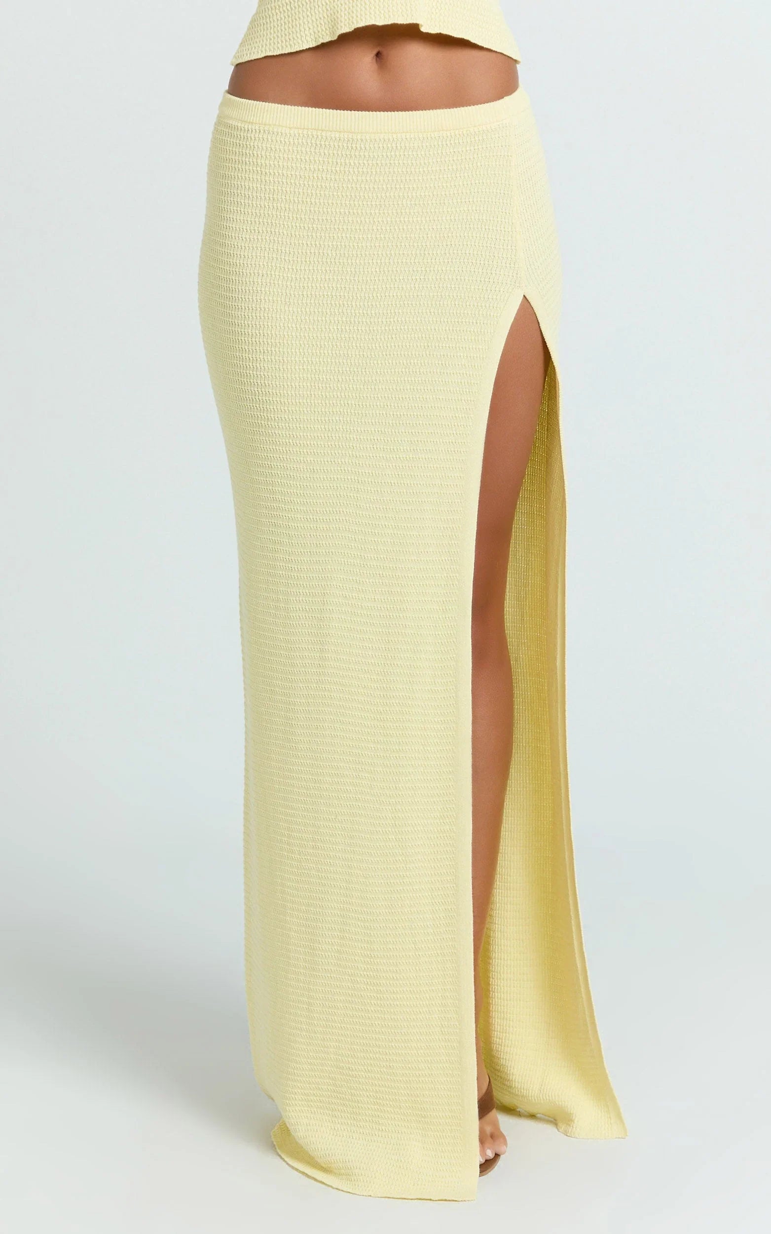 This low-waist crochet maxi brings flirty energy in zesty lemon with a thigh-high split that shows just enough. Effortlessly chic for holidays, brunches, and nights out, it nails Minimalist Chic with a statement twist, think sleek lines, elongating silhouette, and a body-skimming vibe that moves with you. The yellow hue pops against sunkissed skin while the split adds drama for that legs-for-days effect.