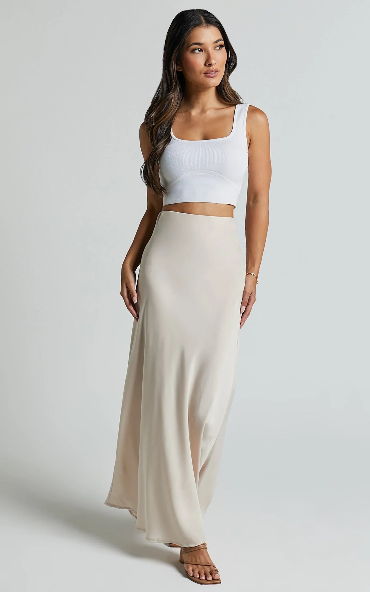 Featuring a flattering high-waisted, bias-cut silhouette in luxe oyster cream, this skirt drapes beautifully, subtly highlighting your curves with graceful ease. Capture that dreamy ballerina aesthetic by pairing it with lace-up flats and a delicate wrap top, or channel chic everyday sophistication by styling it with an hourglass jacket and heeled thong sandals.