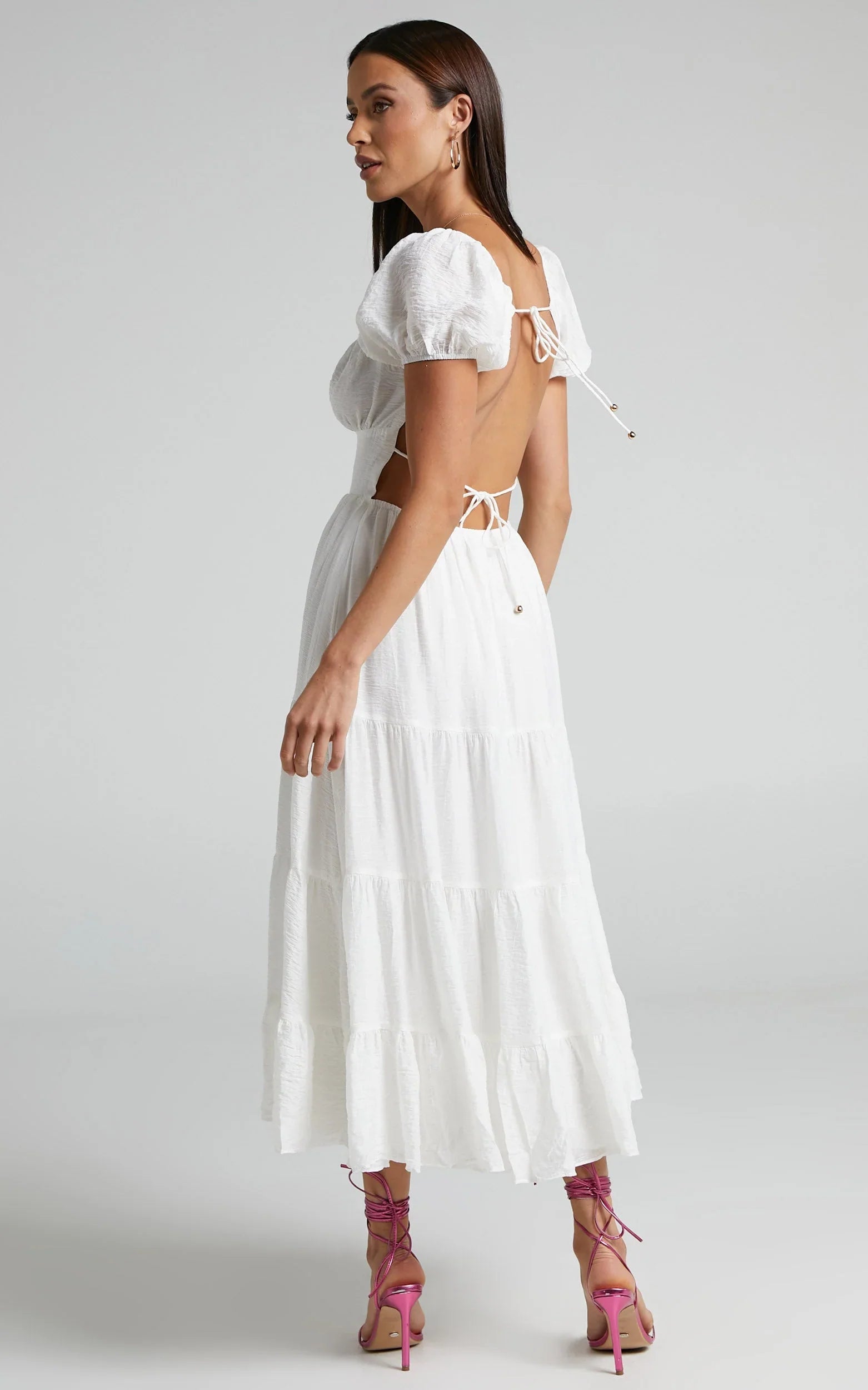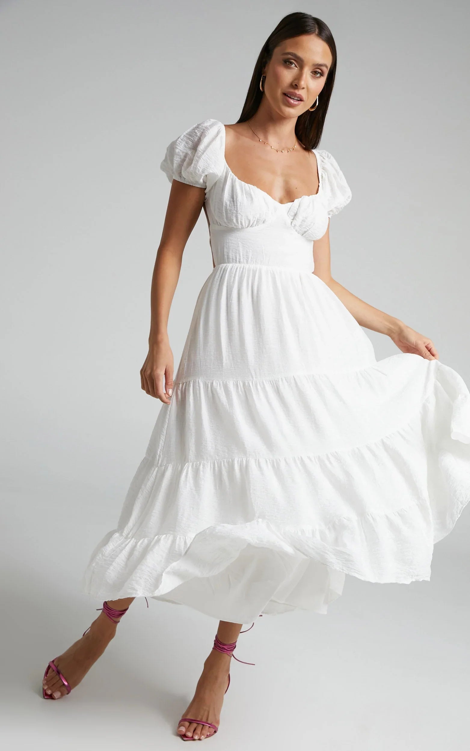 Romanticise your life this summer in the Anita Dress! This floaty midi dress features a sweetheart neckline with ruched bust cups, short puff sleeves, tiered skirt and a fitted waist panel. Perfect to wear during the spring and summer, you can dress it up or down. Wear it for a park stroll with sandals and a wide sun hat or for a lunch date with mules and a mini shoulder bag!