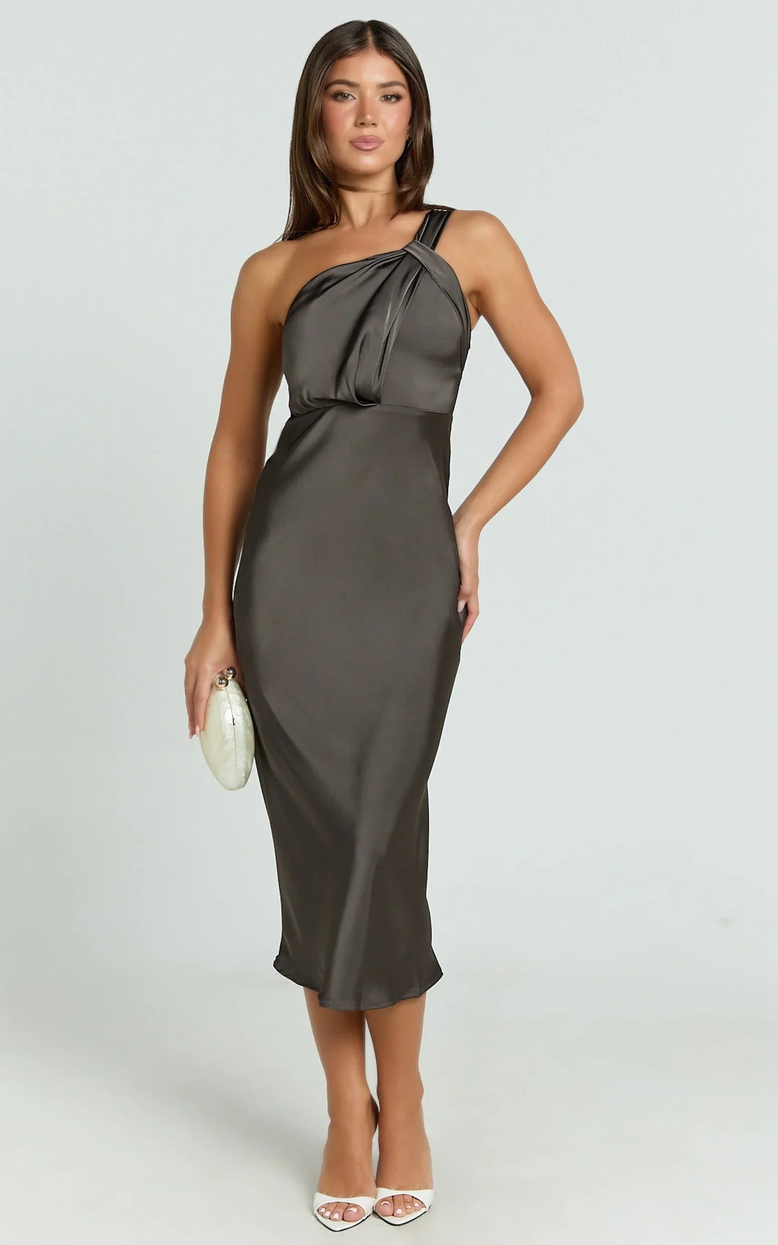 Crafted from a luxurious espresso-brown satin, this dress features an alluring one-shoulder neckline accented with an elegant twist detail. Its flattering bias-cut silhouette gently hugs your curves, highlighting your shape with grace and ease. Channeling a delicate ballerina-inspired aesthetic, this midi dress is ideal for romantic dinners and chic cocktail evenings.