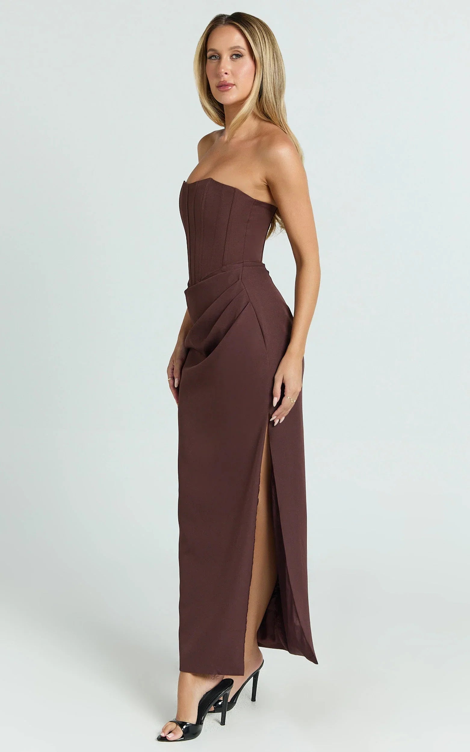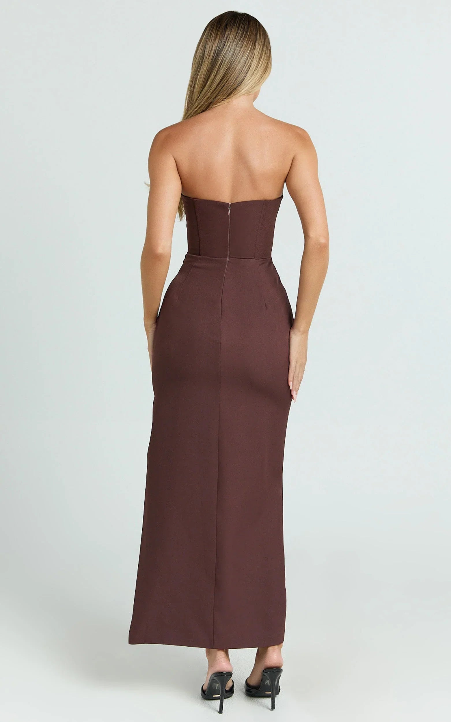The Avery Midi Dress in Chocolate brings sleek sophistication with its strapless neckline, draped side split, and form-skimming silhouette that transitions effortlessly from evening champagne to after-hours shine. The rich chocolate hue reads polished and modern, while the subtle drape detail adds movement and interest without ever losing its elegant core. Style with minimalist heels, a sultry clutch, and delicate gold hoops for a refined finish that makes an entrance.