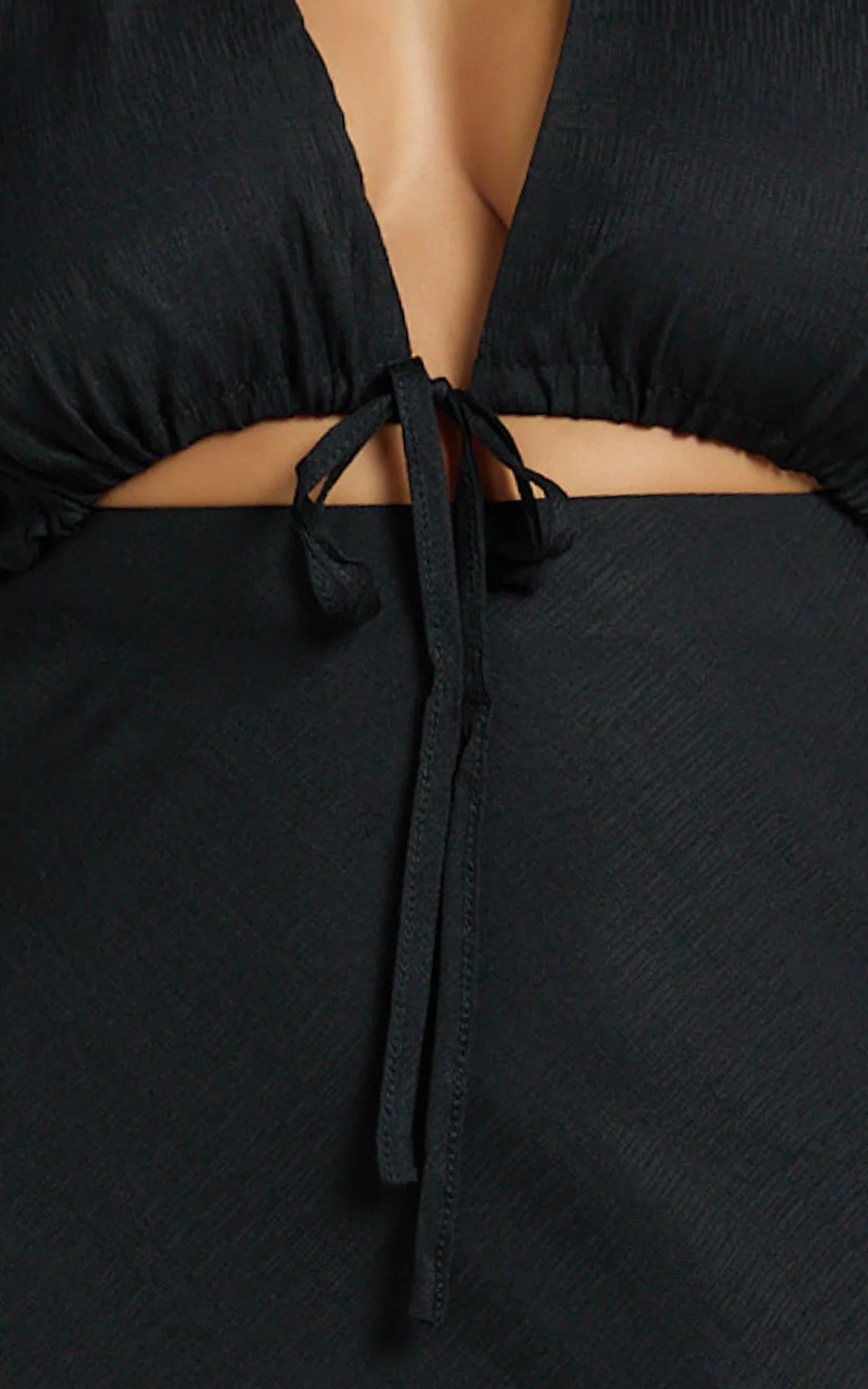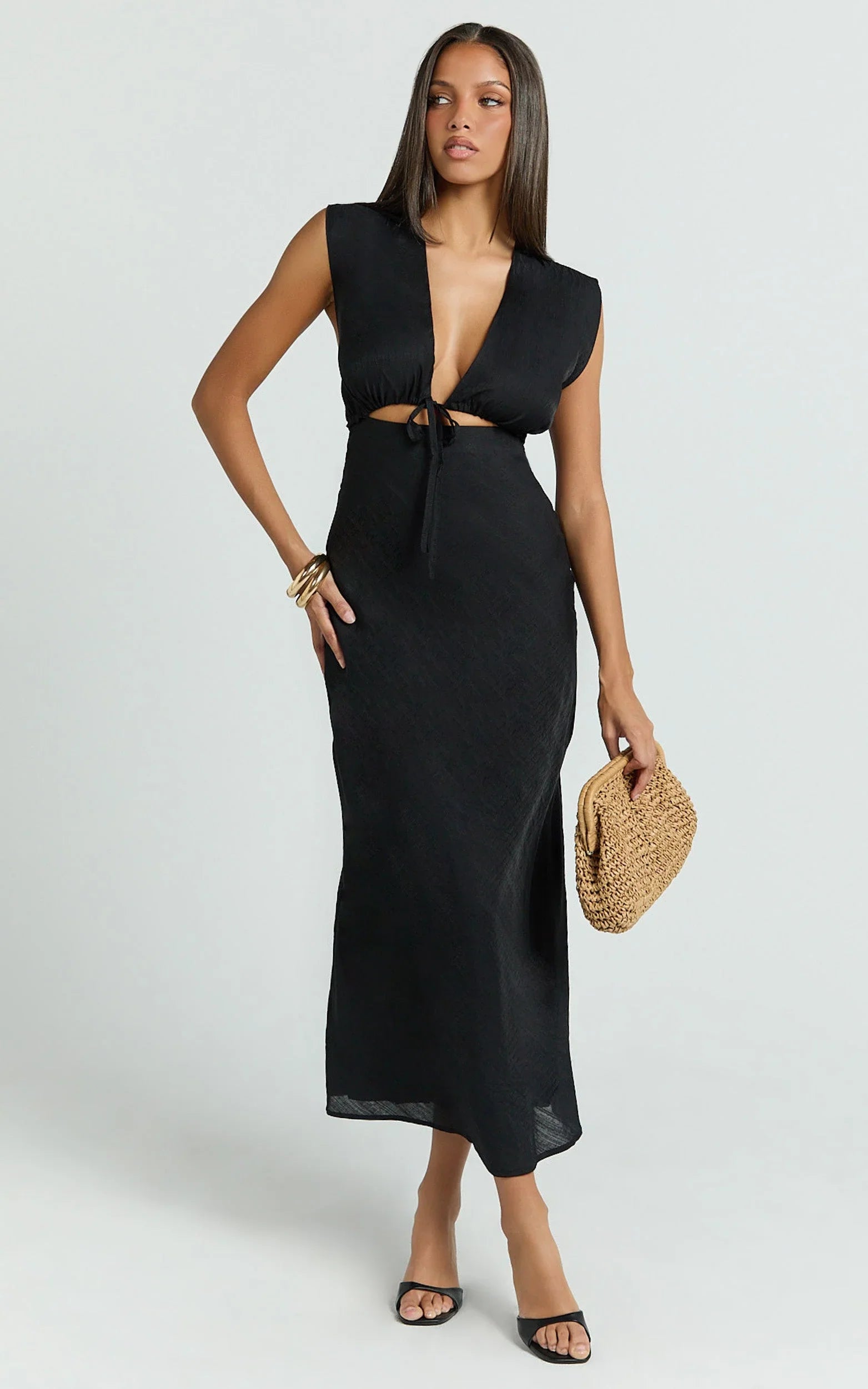 The black hue keeps it sleek while the daring neckline and waist peekaboo bring the heat, perfect for date nights, celebrations, and every after-dark moment that calls for Dresses that turn heads. Style it with Patent-Leather Pumps and Metallic Sunglasses for a high-shine finish, or dial it back with Minimalist Sandals when you want chic without trying.