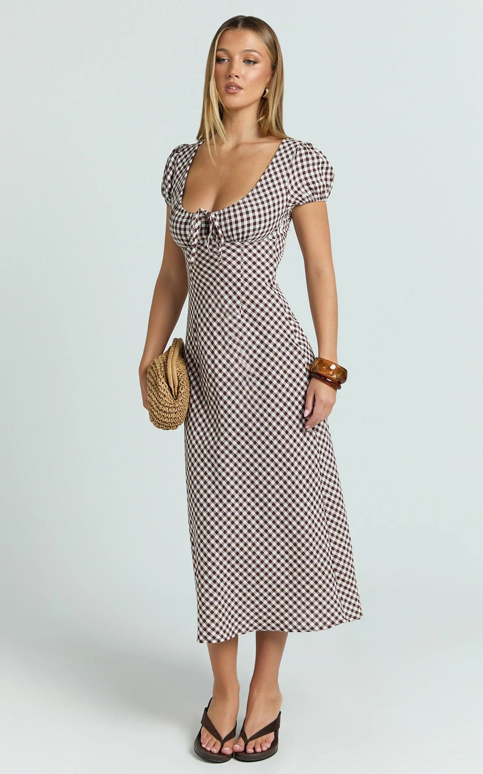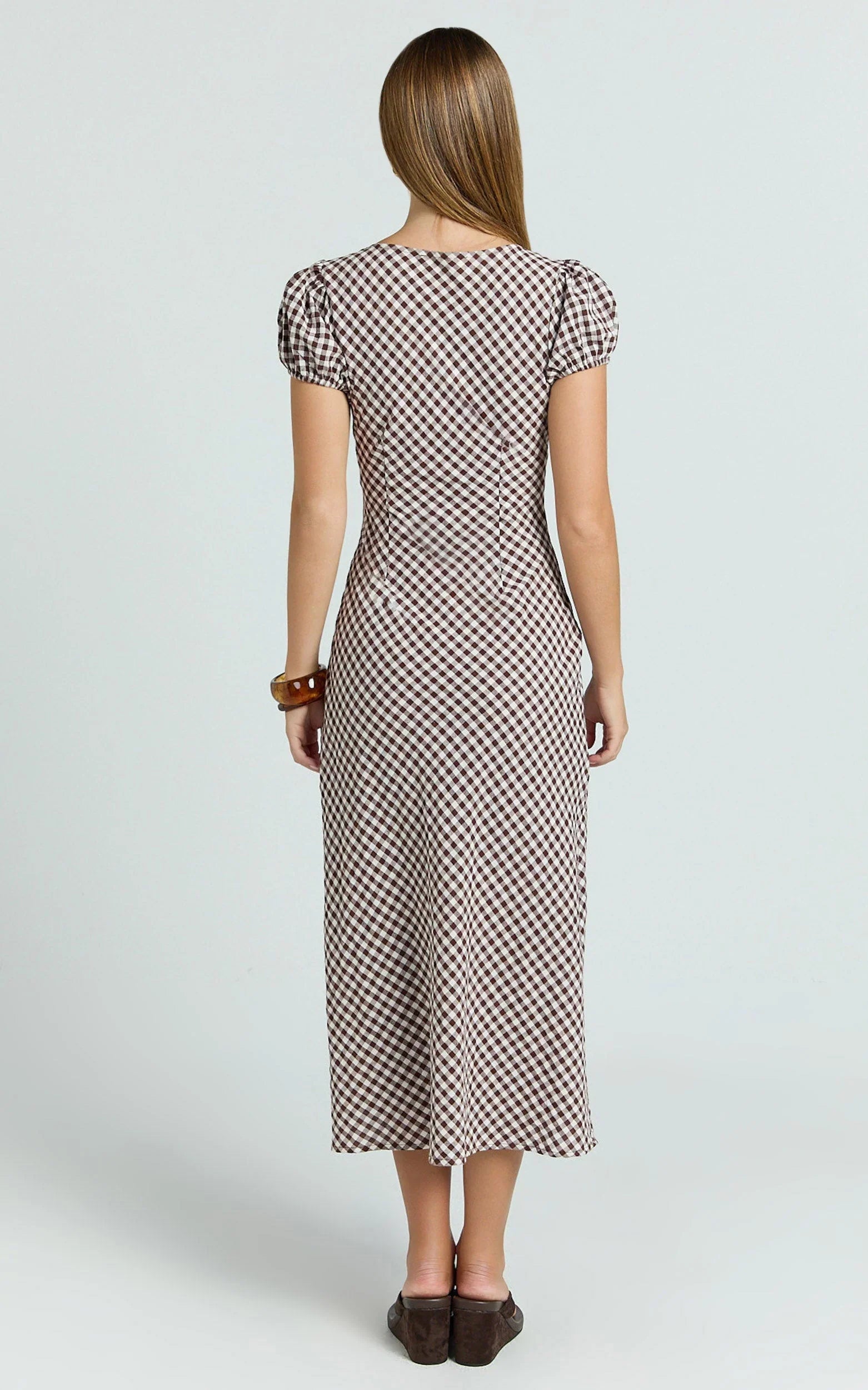 The Bernice Midi Dress in Chocolate Gingham is your easy, everyday showstopper - flattering without trying too hard. The scoop neckline, soft waist definition, and flowy midi hem bring that balletcore-meets-modern energy, while the chocolate gingham print adds a sweet, timeless twist. Perfect for brunch, dates, or dancing the night away. Style it with a delicate pendant necklace to highlight the neckline, or keep it casual with sneakers and a crossbody bag for off-duty cool. Dress it up with strappy heels, gold hoops, and a mini clutch for a flirty finish, or go boho with loose waves and a woven tote. Versatile, chic, and seriously cute - this midi’s made for repeat wear.