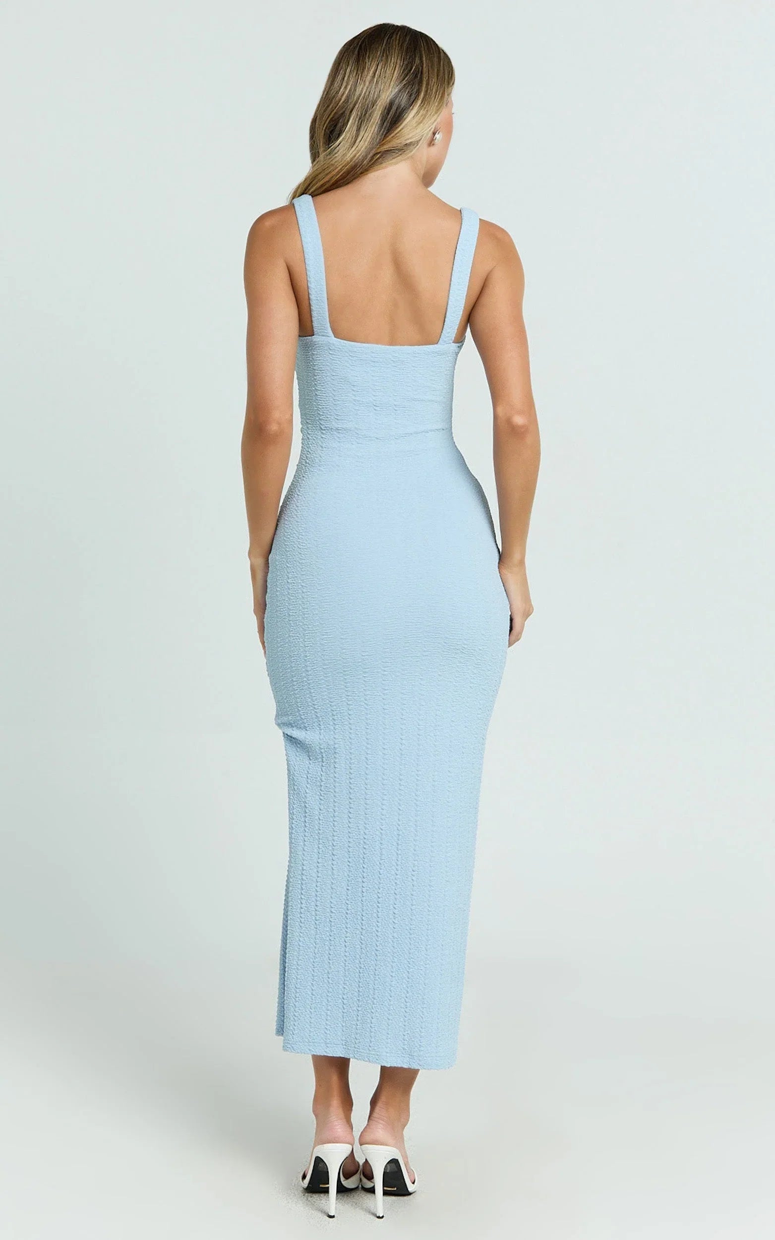 The twist front cut out and ruched details sculpt a stunning silhouette, while the dreamy baby blue hue keeps things fresh and flirty. This show-stopping piece is made for big entrances, perfect with strappy sandals for nights out or paired with a slicked-back bun and Shell Pendant for that modern-chic vibe.