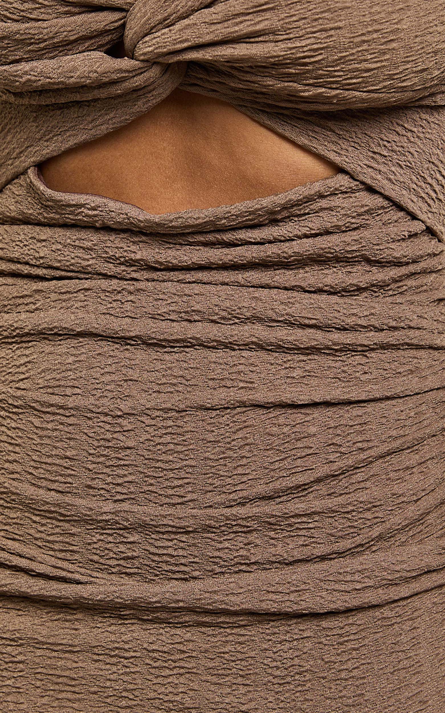 Designed with a flattering twist front, alluring cut-out detail, and figure-enhancing ruching, this brown midi dress perfectly blends minimalist elegance with streetwear-inspired style. Its versatile hue makes it easy to pair, go casual with crisp white sneakers, or elevate your outfit with your favorite handbag and trendy jewelry.