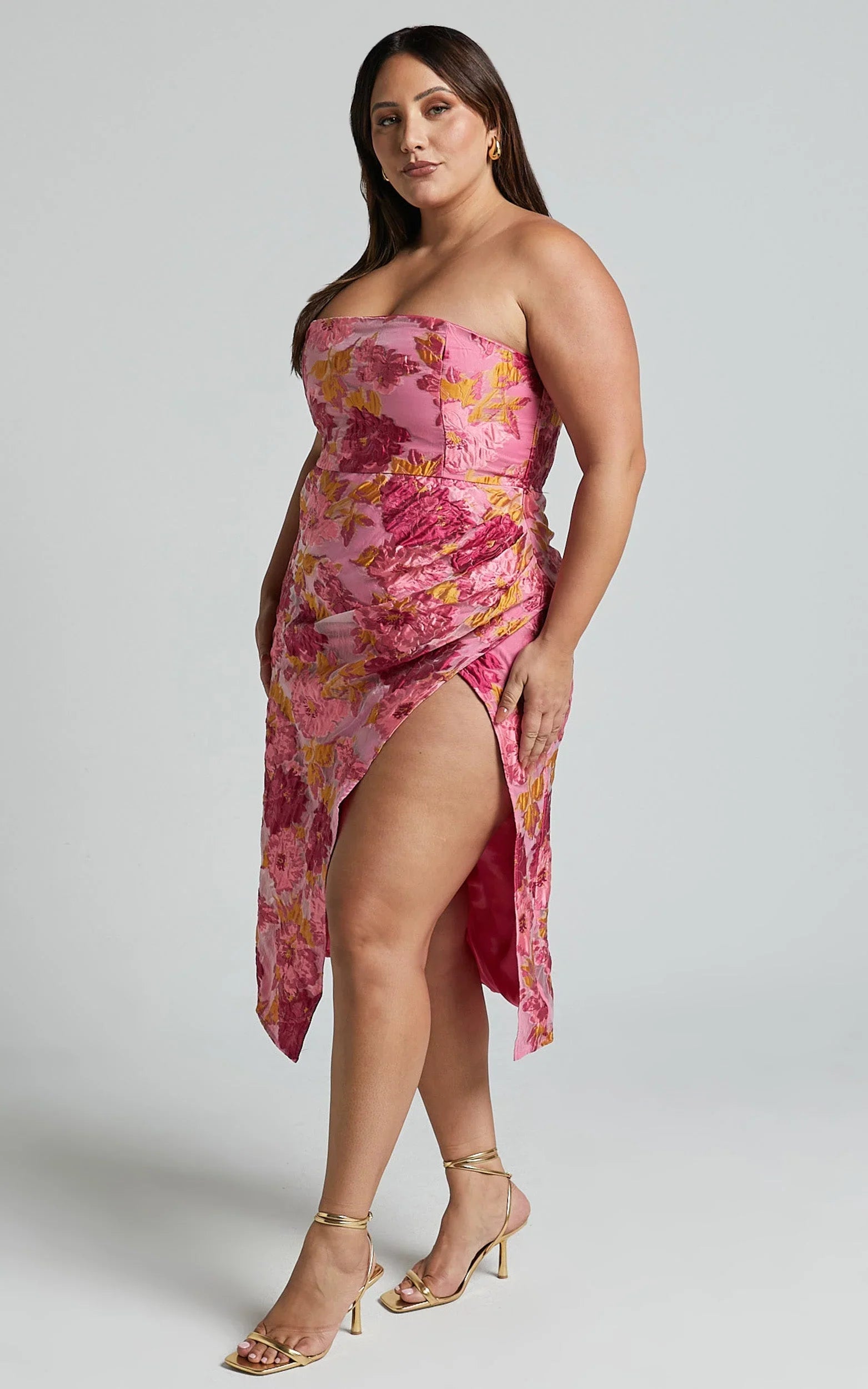 Designed in a romantic pink jacquard fabric, this strapless midi is your go-to statement piece for cocktail parties or dreamy date nights. Featuring a flattering tailored fit that hugs your curves and a bold thigh-high split, this dress blends elegance with runway-ready flair.