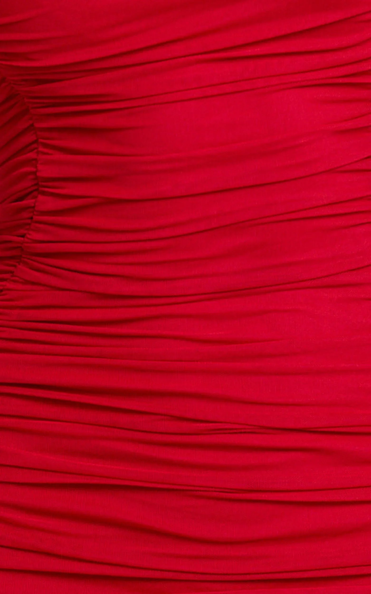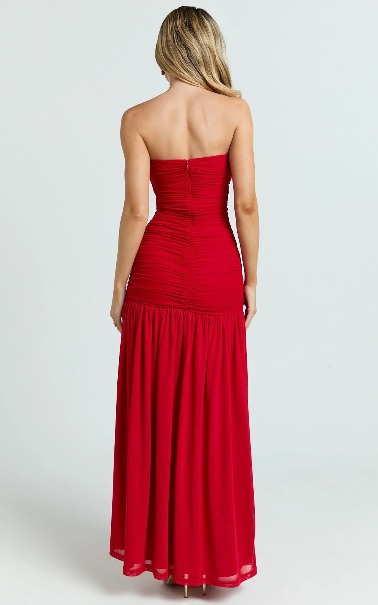 The Cardi Maxi Dress - Ruched Mesh High Leg Split Dress In Red dials up after-dark glamour with a sleek, body-loving fit and flirty ruching that moves with you. Style it with metallics or sculptural volumes in your accessories for a runway-fresh finish, and let that high split do the talking. Dresses that steal the spotlight? Found.