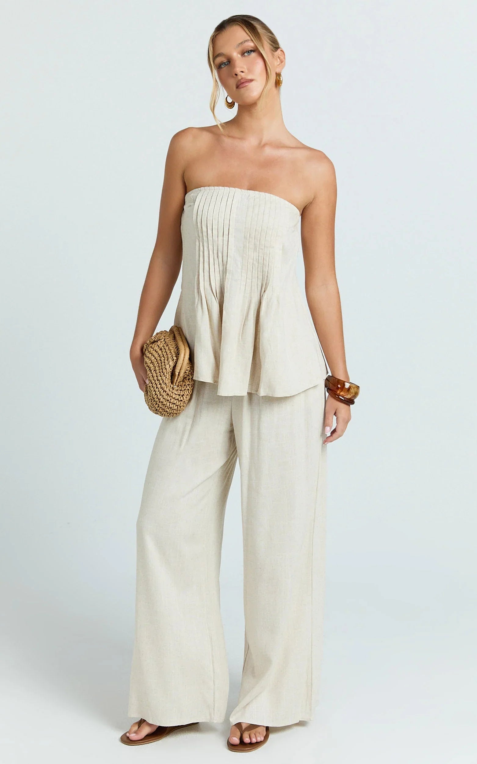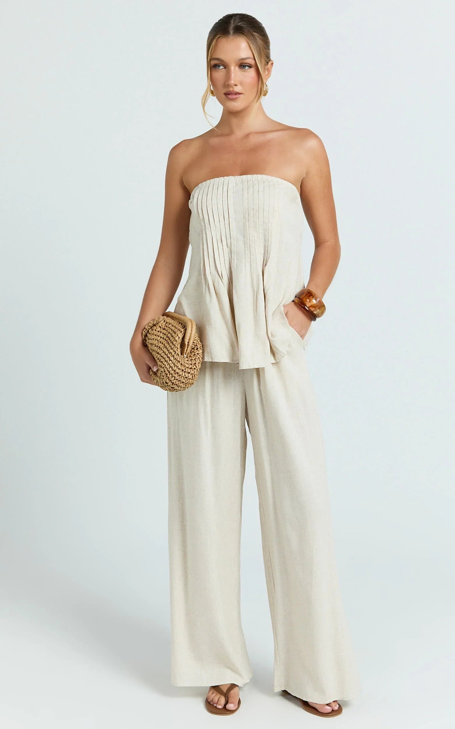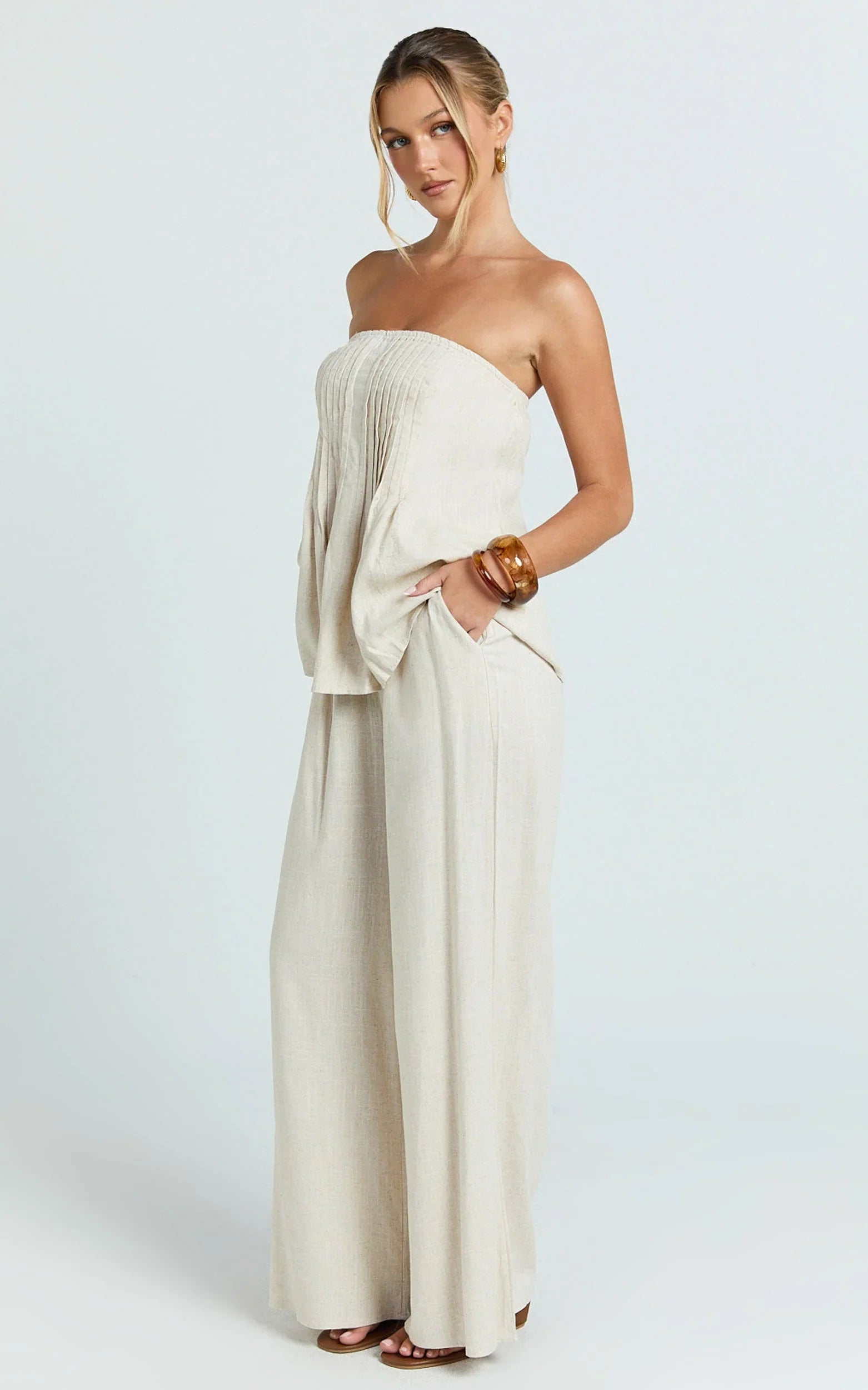 The Carli Two Piece Top and Pants Set in Beige serves minimal energy with maximum payoff, think clean tube top, easy wide-leg pants, so flattering pulled-together. A set that works from coffee catch-ups to late-night plans. The neutral tone keeps it effortlessly chic, while the streamlined silhouette creates that “I woke up like this” vibe. Carli is your grab-and-go outfit formula: mix and match with pieces you already own, or wear the full set for instant impact. Style with a pendant necklace and sleek slides for day, then switch to heels and a sharp blazer layer for after-dark. Want a cool contrast? Tap the sneaker trend to keep it fresh and off-duty. Easy, elevated, and endlessly wearable.