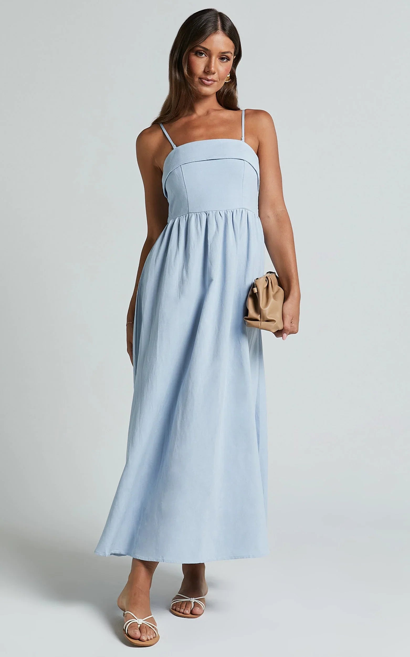 Make a statement in the Carlyn Midi Dress - Linen Look Detachable Straps In Blue. This dress is perfect for those casual days when you want to look effortlessly chic. Made with a linen and cotton blend, it offers both style and comfort. The straight silhouette and midi length create a flattering fit for all body types, while the sleeveless design keeps you cool during warm weather. With its detachable straps, this versatile dress can be worn multiple ways to suit your personal style. Whether you're heading to brunch or out for a day of shopping, the Carlyn Midi Dress is an essential addition to any fashion-forward wardrobe.