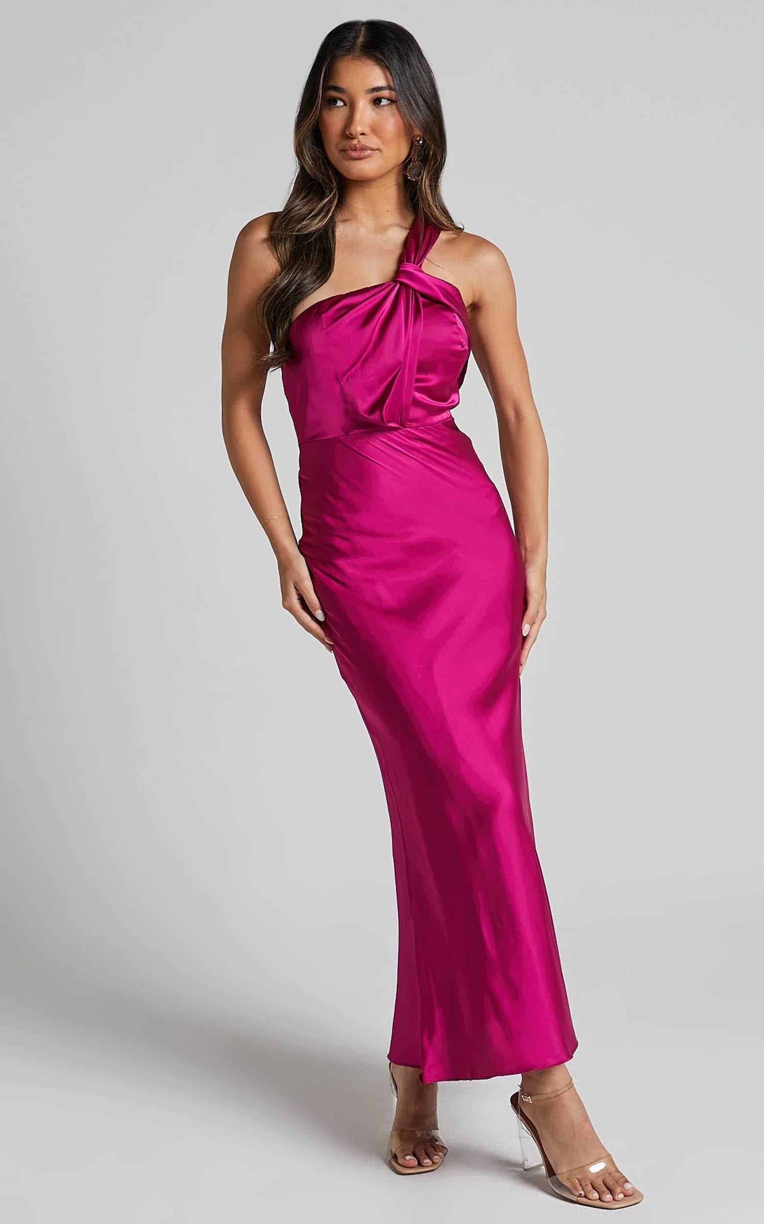 Make a statement in the Carmella Midaxi Dress - One Shoulder Twist Detail Dress In Grape. This stunning pink slip dress is perfect for any occasion, from cocktails to weddings. The midaxi length adds a touch of elegance, while the one shoulder twist detail adds an unexpected twist. Crafted from luxurious satin and acrylic blend, this dress will make you feel like a queen.