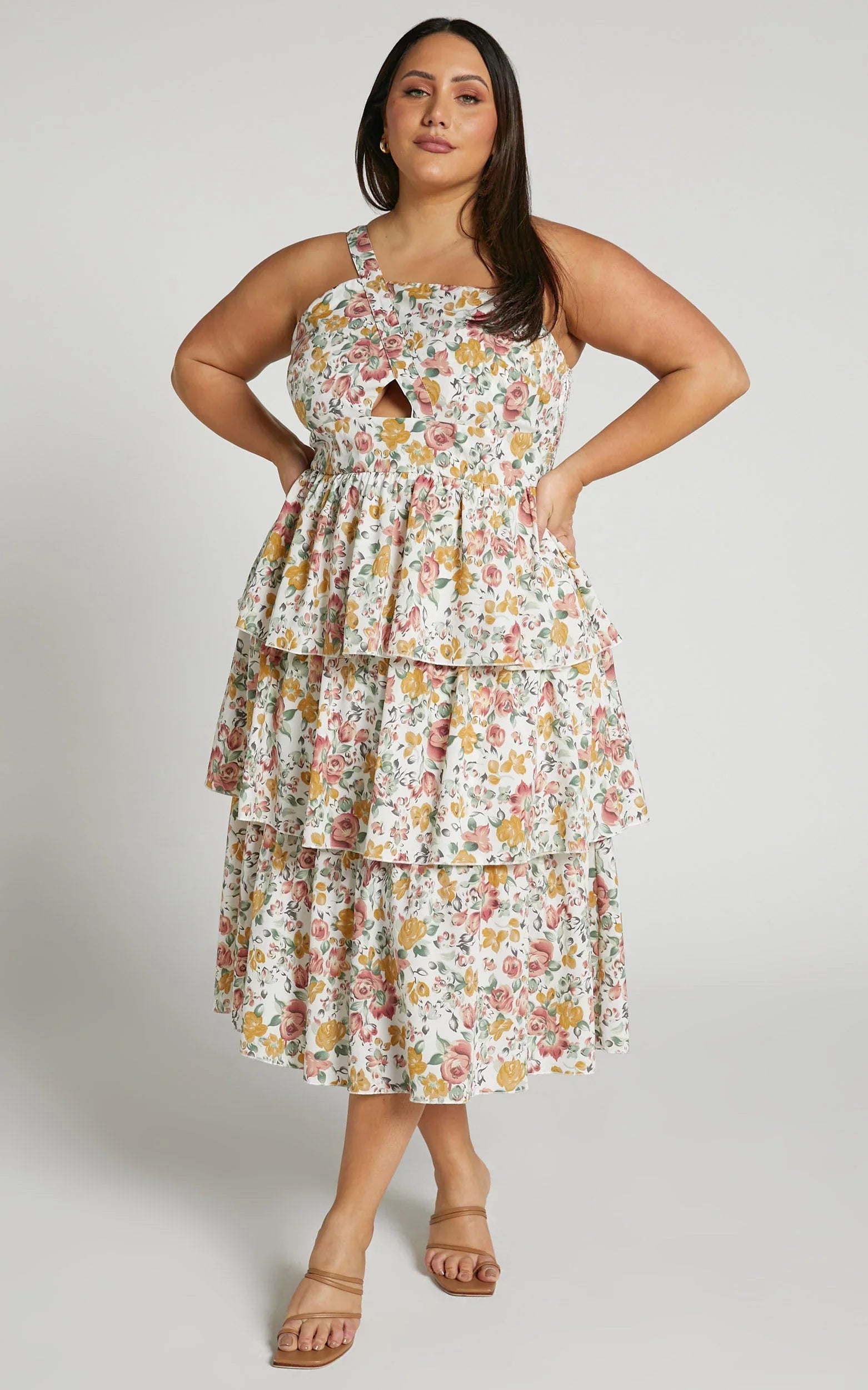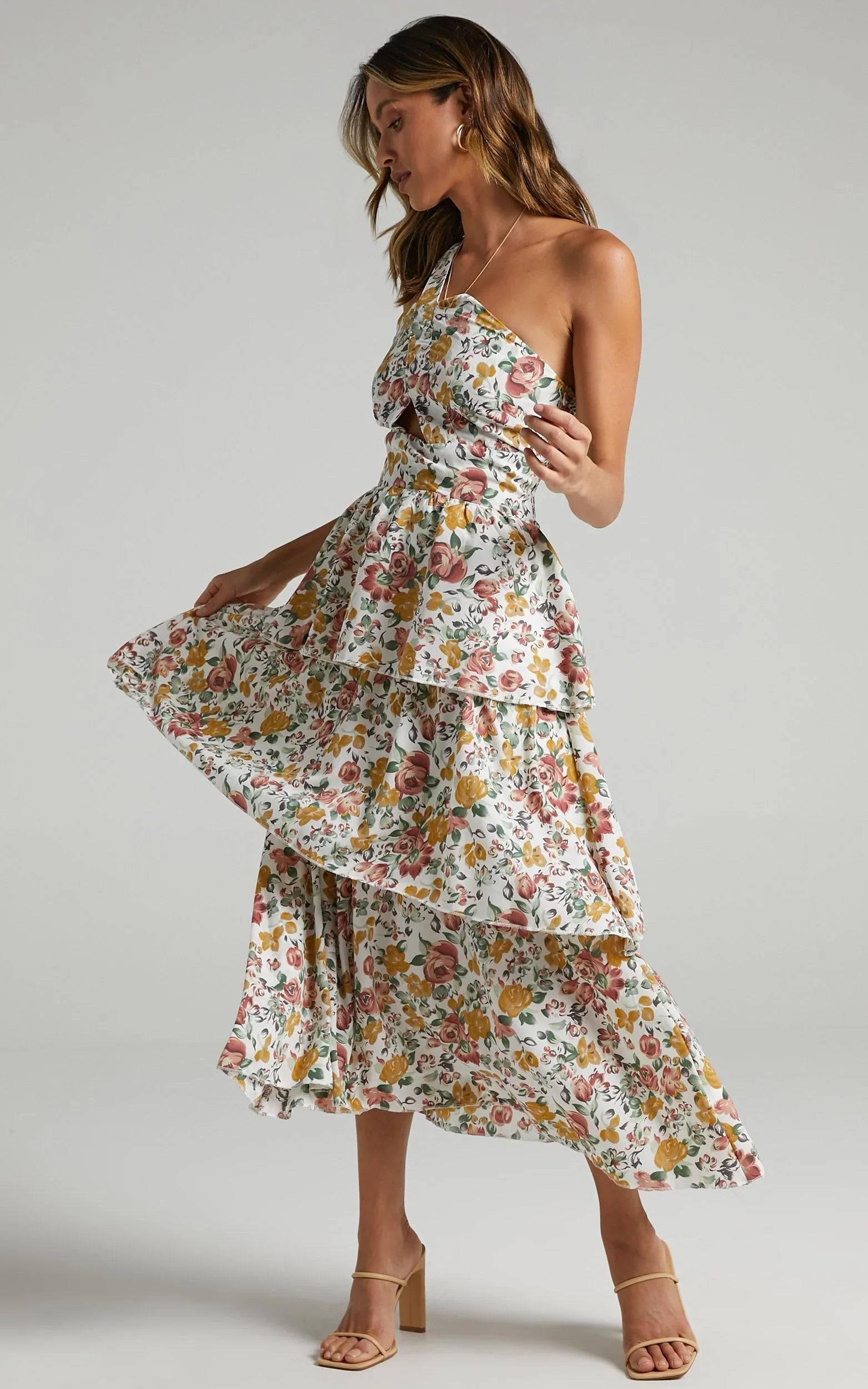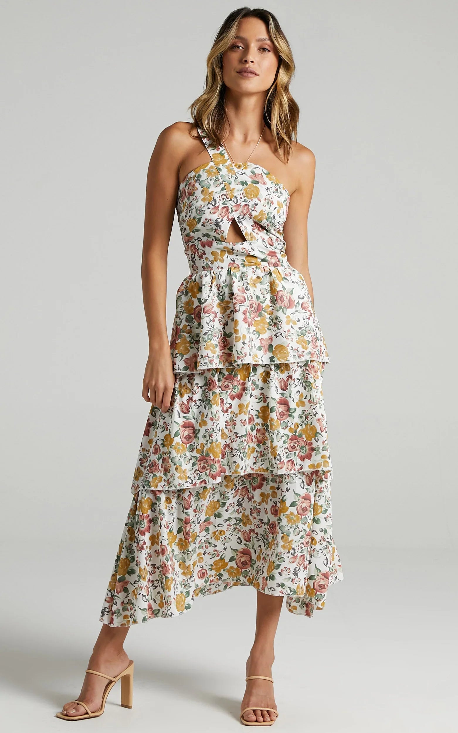 Serve up a chic floral moment in our Caro Dress! This gorgeous one shoulder midi features tiered ruffles on the skirt, cut-out detail under the bust and a shirred back. It is the perfect piece to wear to day parties or events that are coming up. Pair it with some nude sandals and a mini top handle bag to match for a sweet day look!