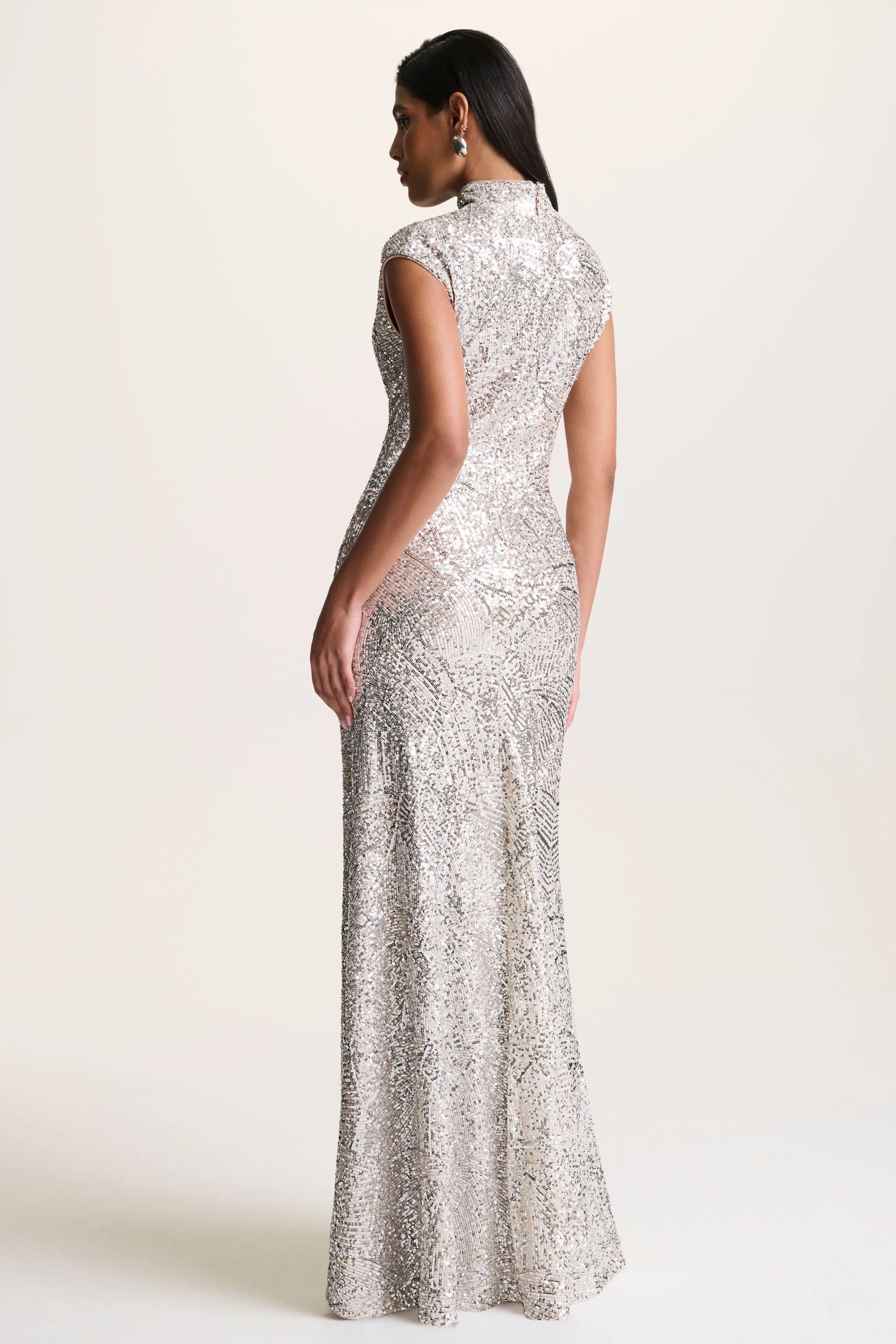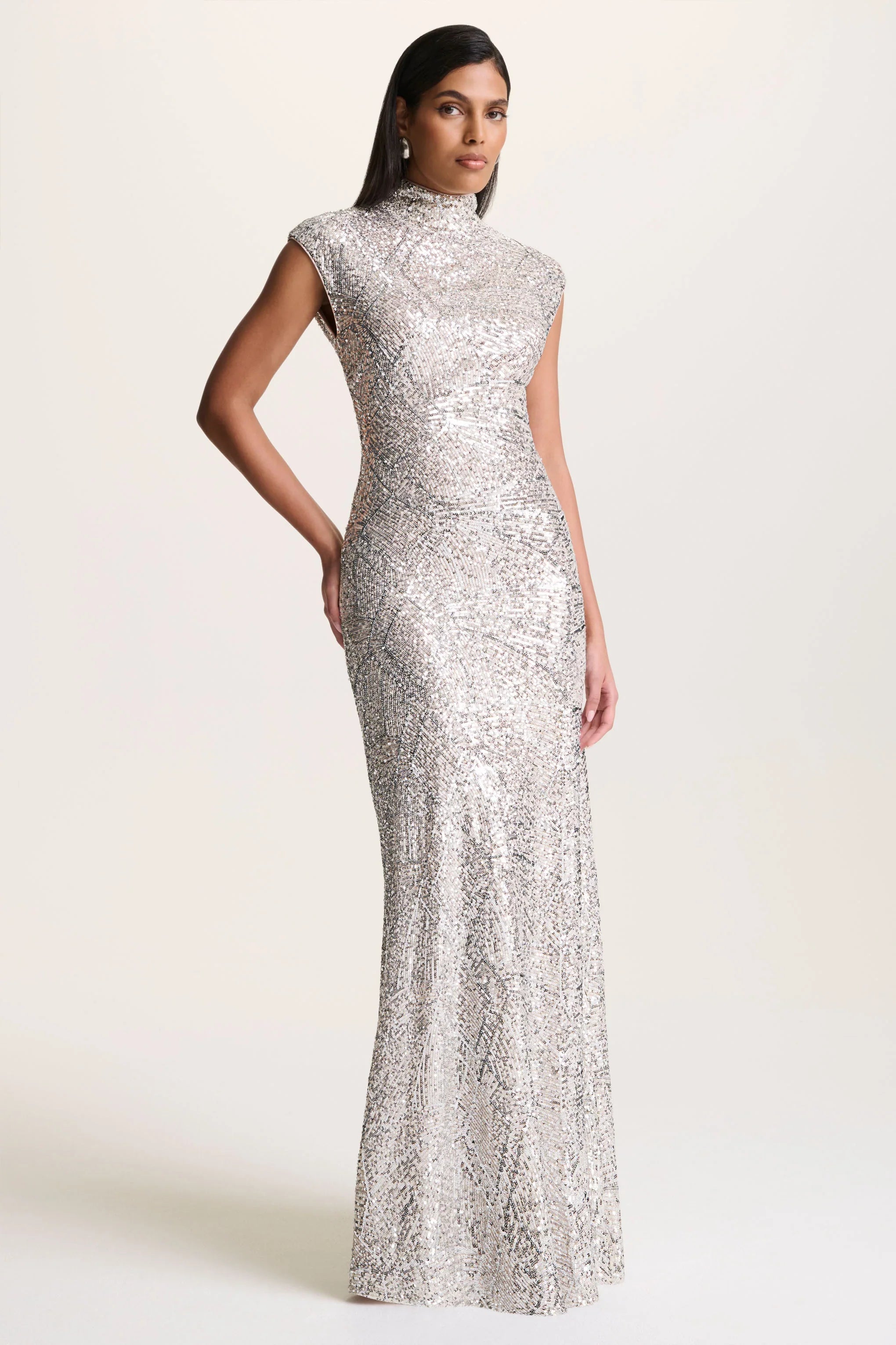 Make a dazzling entrance in Cecy, a timeless design that embodies effortless sophistication. Crafted from our premium silver sequin, this stunning maxi dress shimmers beautifully with every step. The elegant high neckline and chic cap sleeves create a refined silhouette, perfect for the most glamorous of occasions. Sleek, striking, and endlessly captivating- Cecy is made for memorable moments.