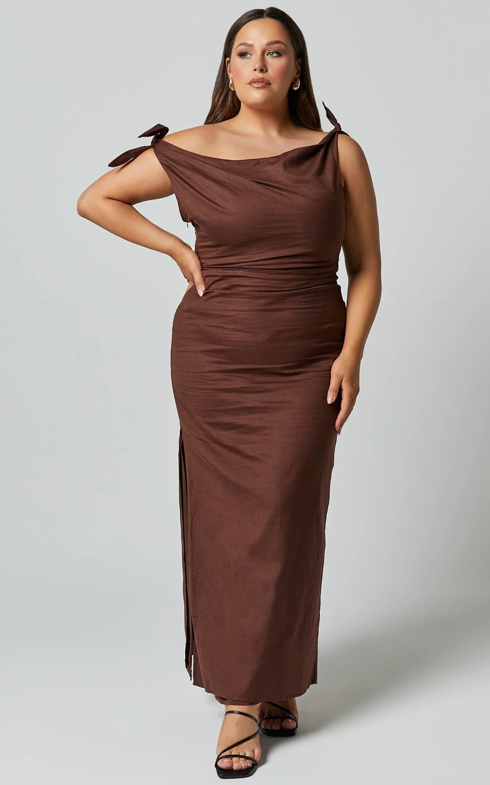Crafted in rich chocolate linen, this off-the-shoulder piece perfectly blends comfort with chic sophistication. Its flattering column silhouette highlights your curves beautifully, while the thigh-high asymmetrical side split adds a playful yet refined touch, ideal for garden parties, dinner dates, and everything in between.
