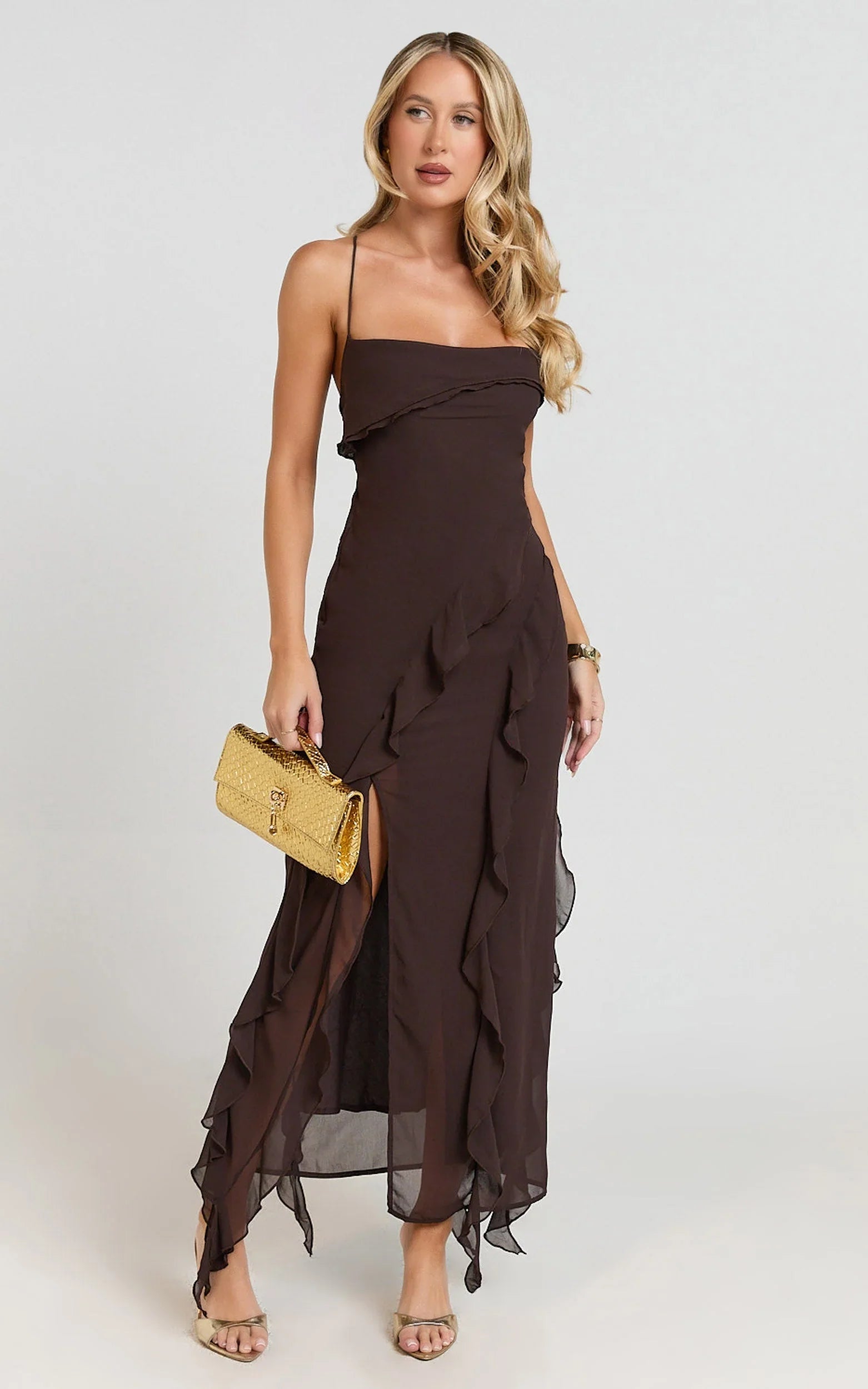 Ruffle detailing adds movement and shape, while the elegant length keeps it polished for date nights, weddings, and everything in between. A nod to Bowcore and Rosettes gives this piece a romantic edge that feels fresh, playful, and totally now, your Dresses lineup just got a major upgrade.