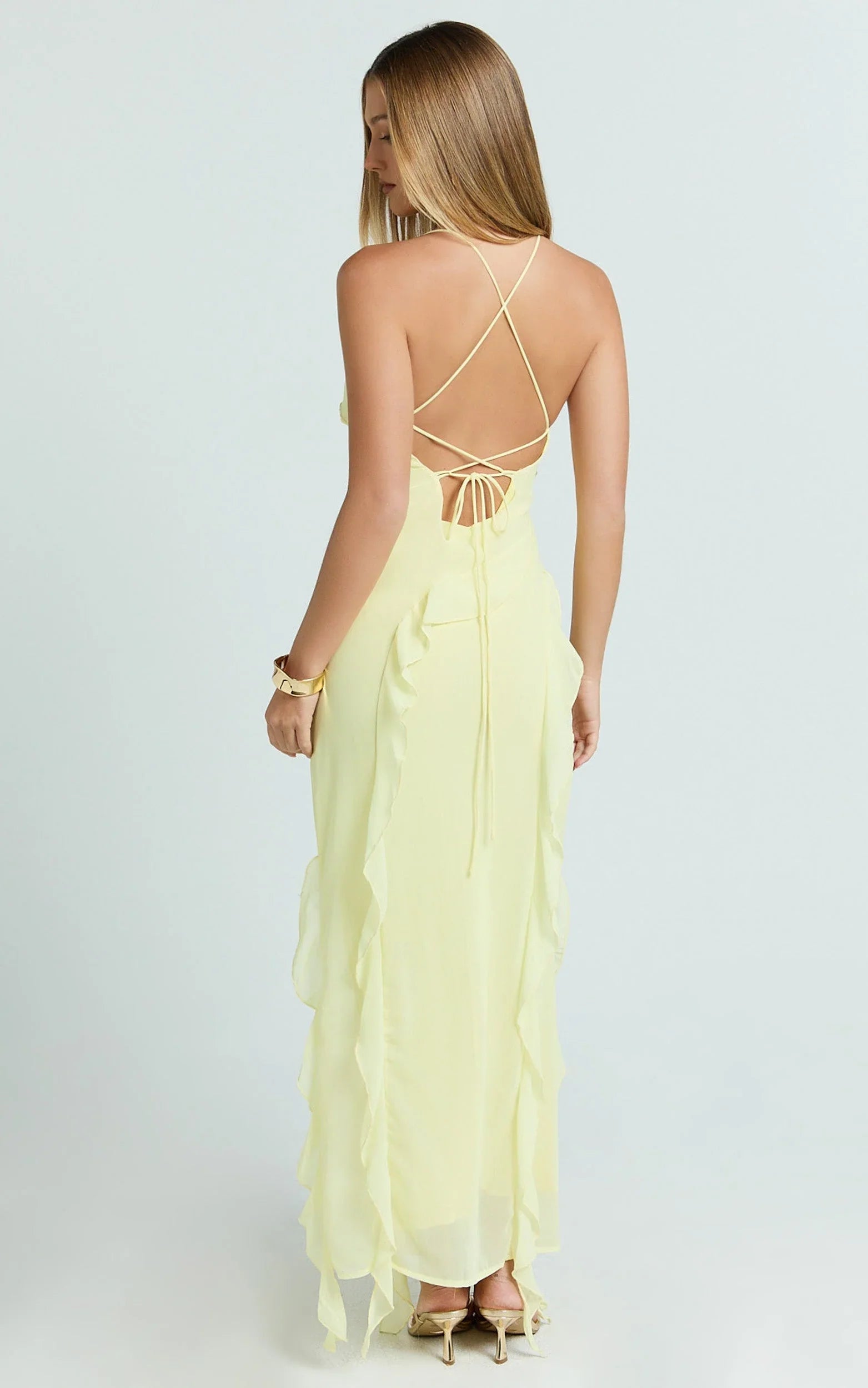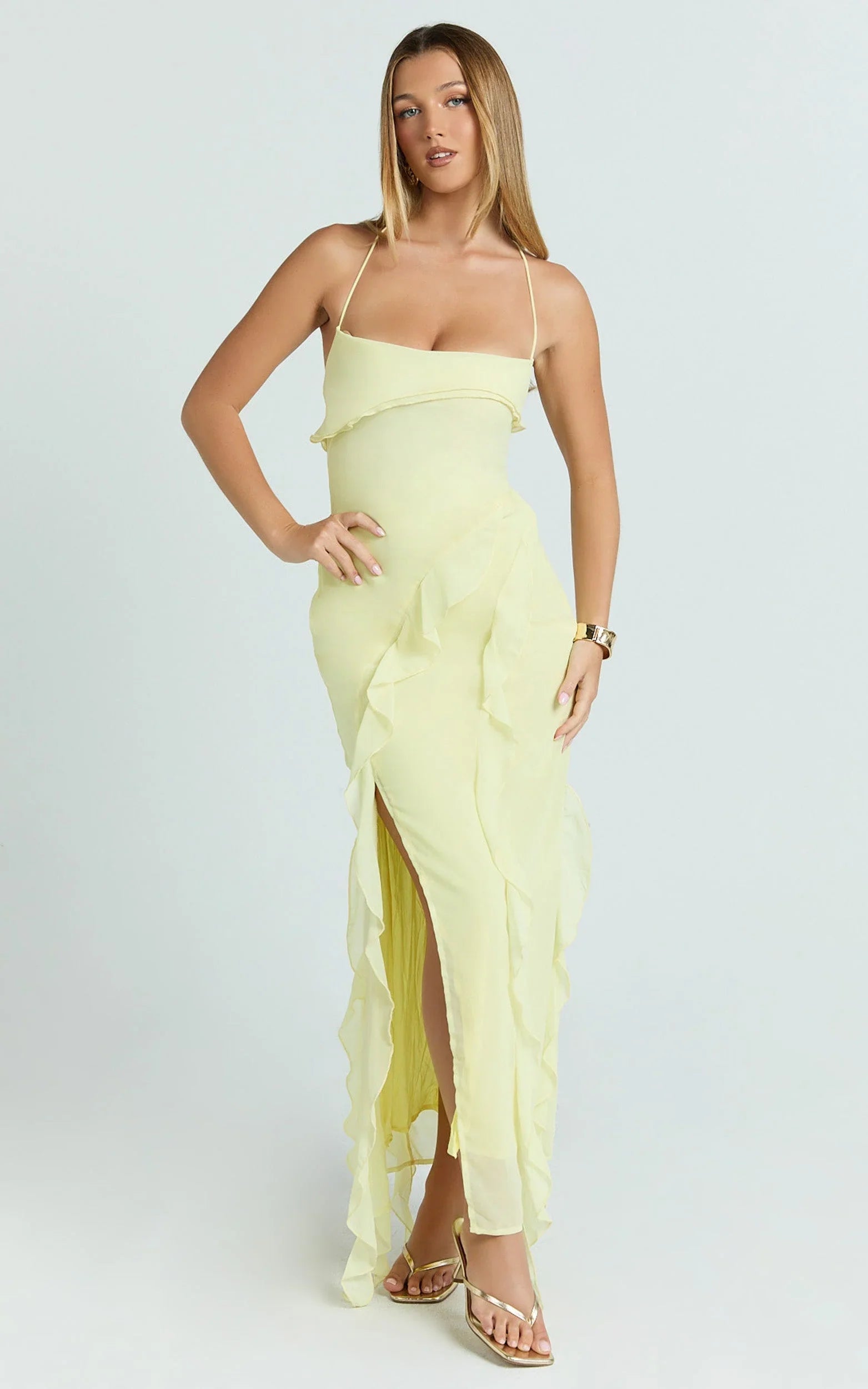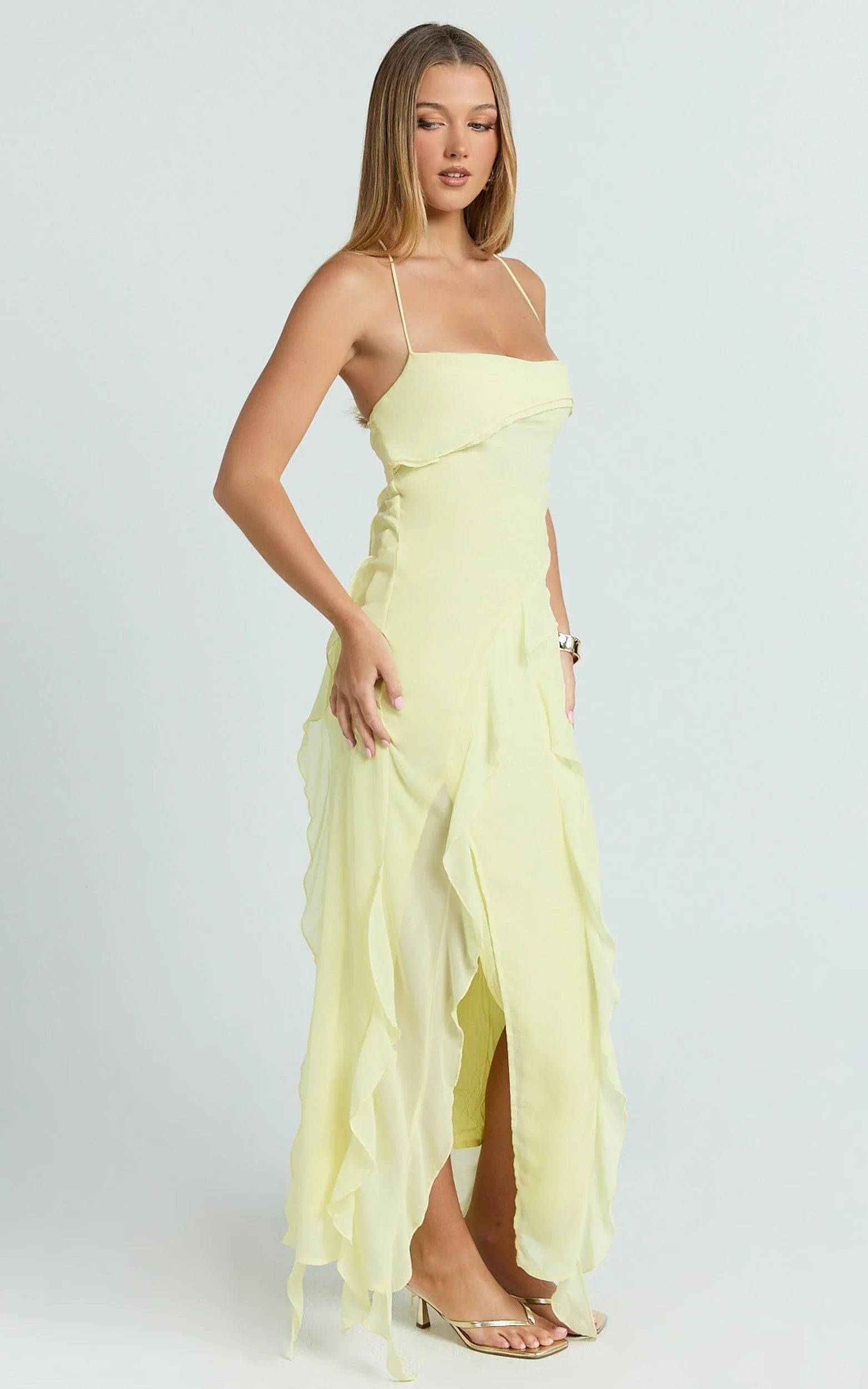This yellow midi is your instant mood lift with flirty ruffle detailing and a curve-skimming silhouette that’s perfect for Dresses season. Butter yellow vibes meet soft movement through the skirt for a look that goes from brunch to dance floor without missing a beat. Style it with a pendant necklace and oversized sunglasses for a Sheer statement of summer ease.