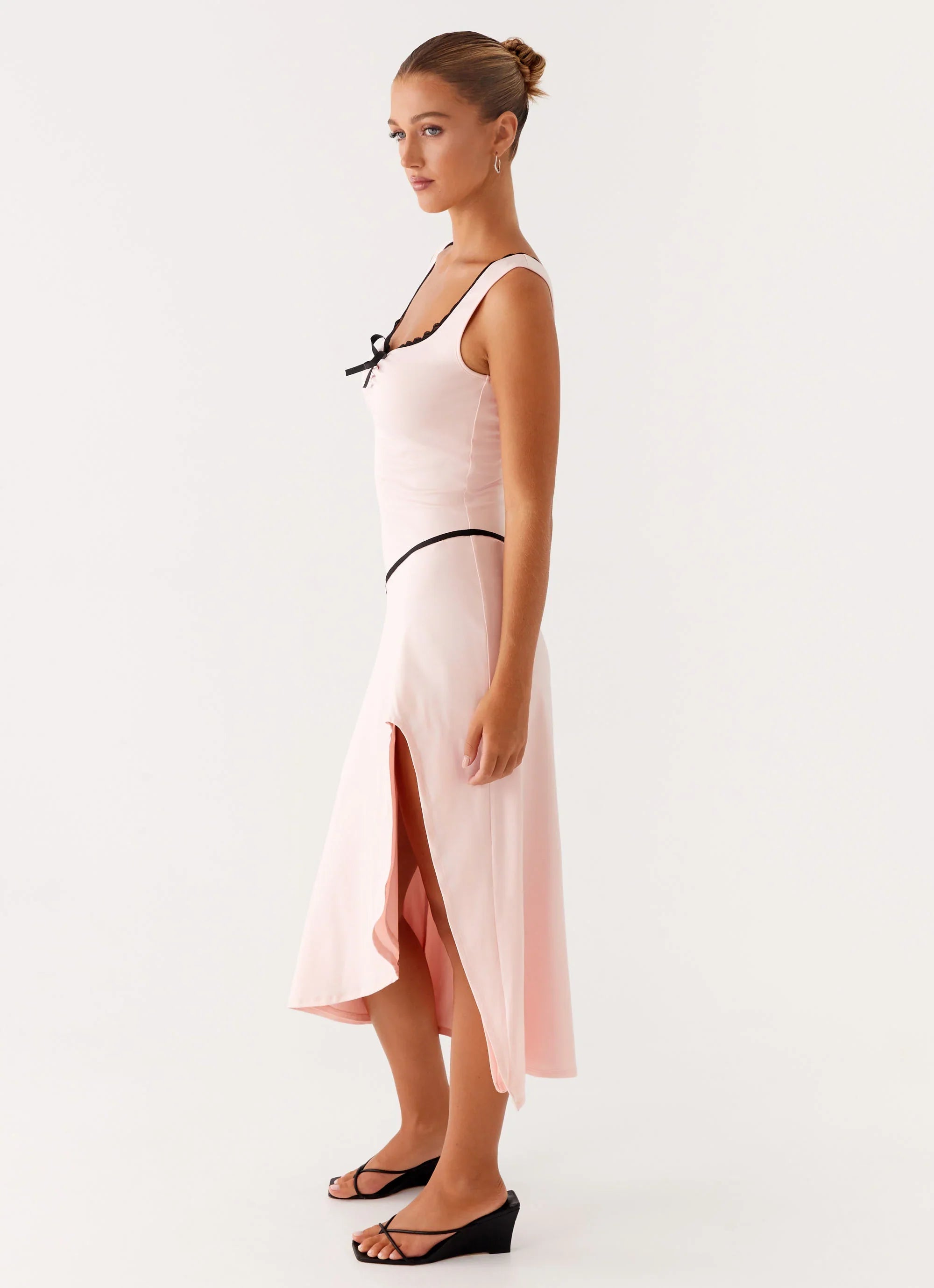 The Darlene Midi Dress is a sultry yet elegant piece, featuring a flattering sweetheart neckline and a daring scoop thigh split. This dress beautifully combines romance with a touch of boldness, perfect for making a statement at any special occasion or night out.