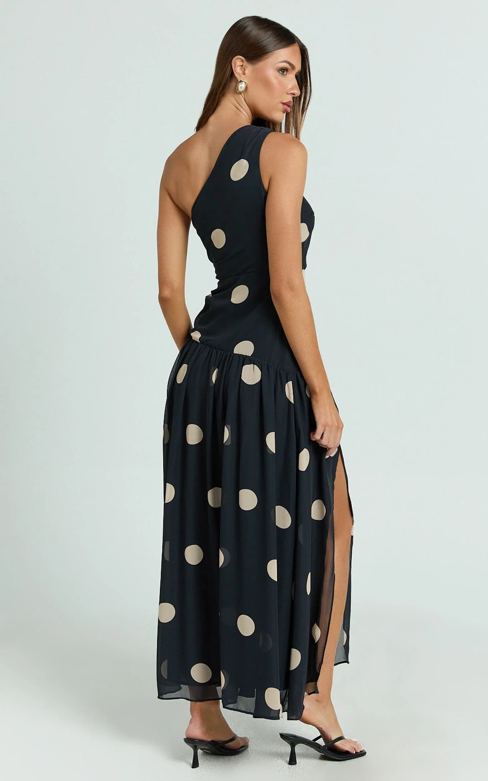 Darlynne Midi Dress - One Shoulder Dress In Black Polkadot is your go-to when you want a Minimalist silhouette with maximum impact. Style it with strappy heels and a mini shoulder bag for cocktails, or add delicate earrings for a polished finish. Perfect for weddings, events, and any RSVP where Dresses are the dress code.