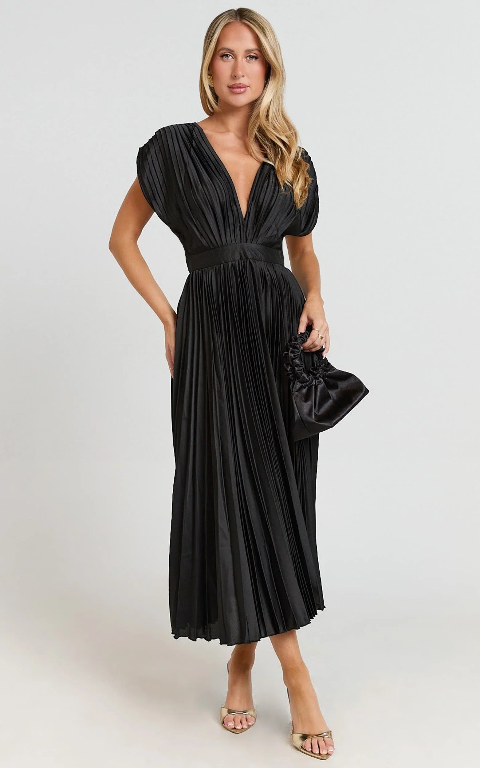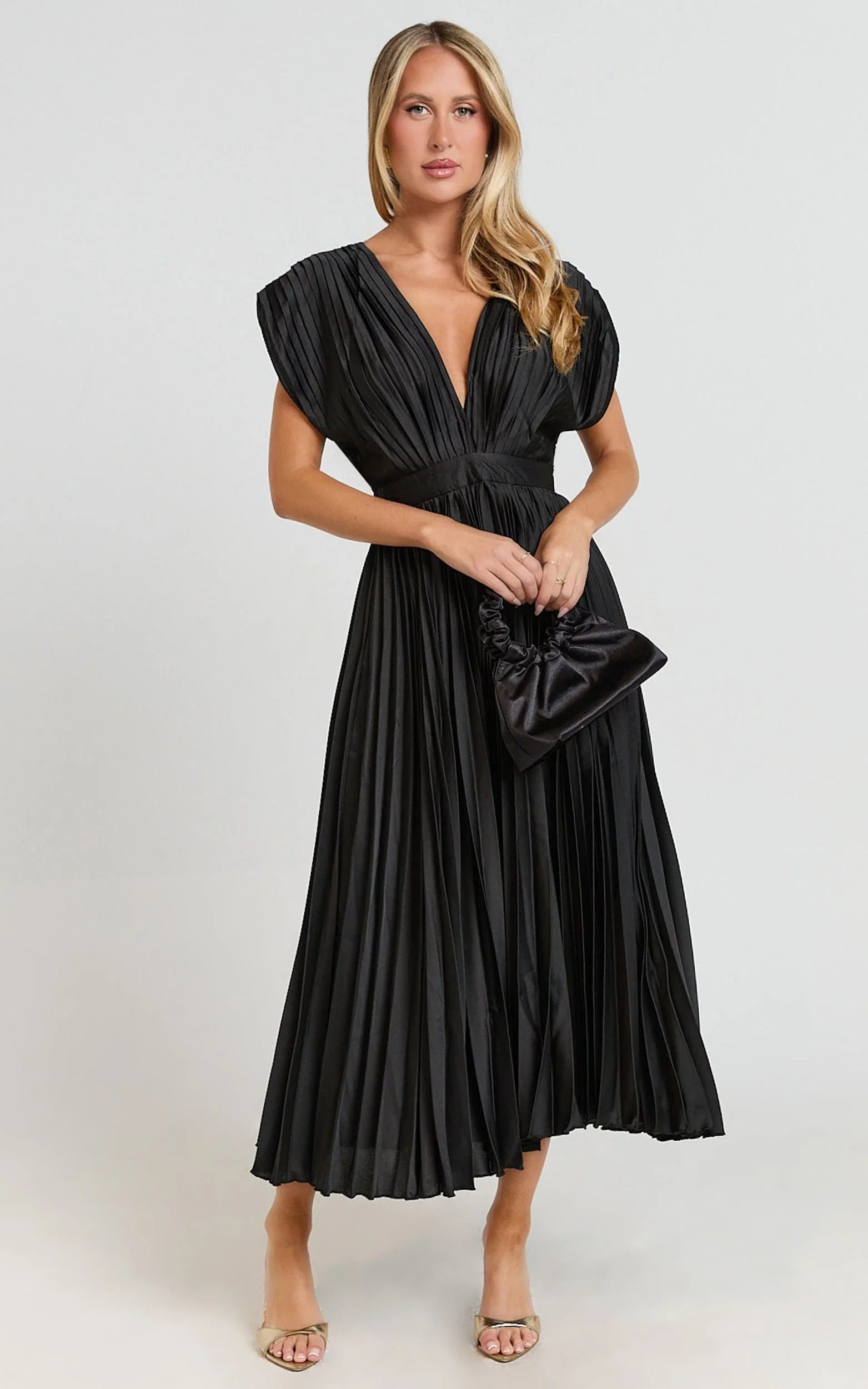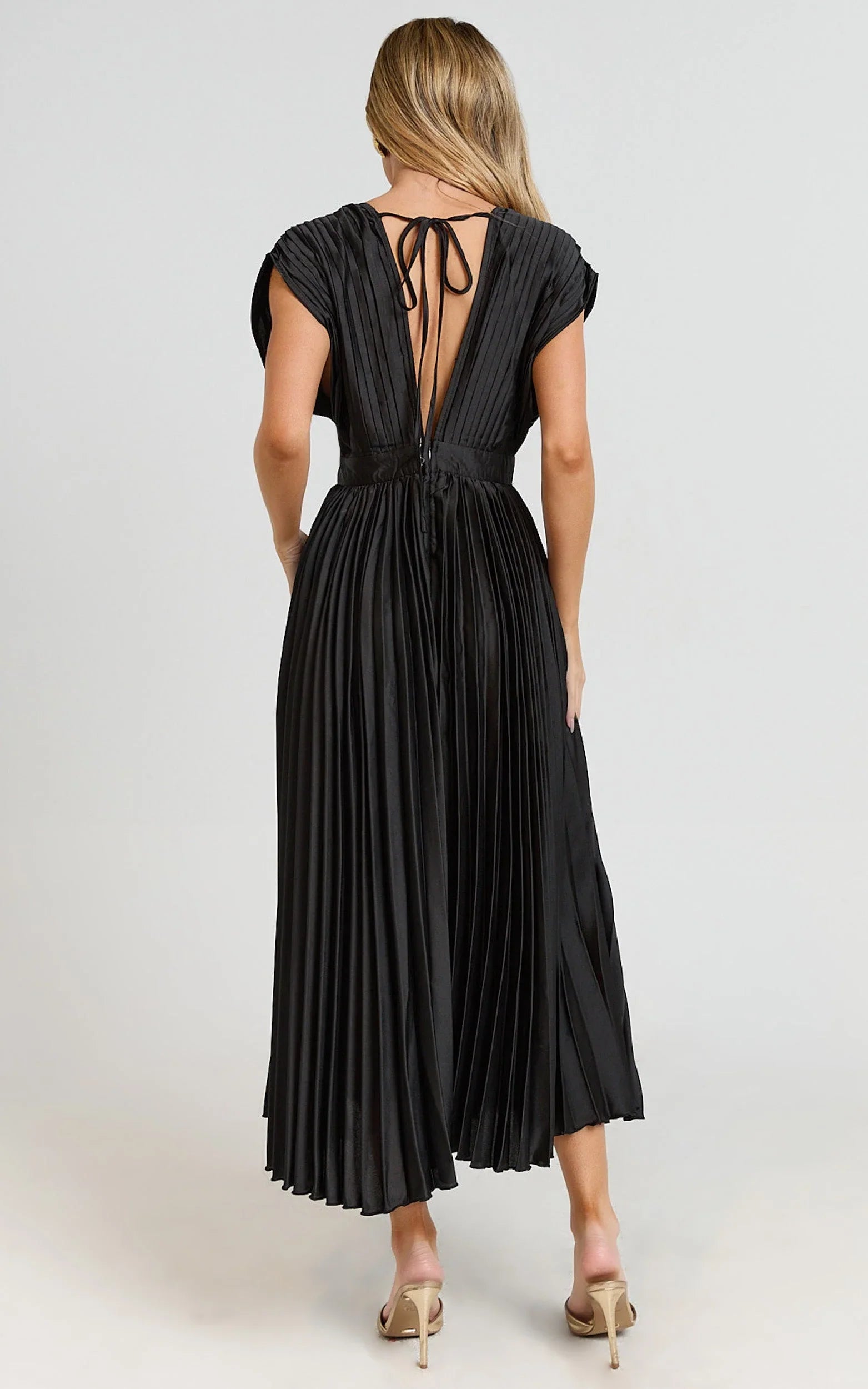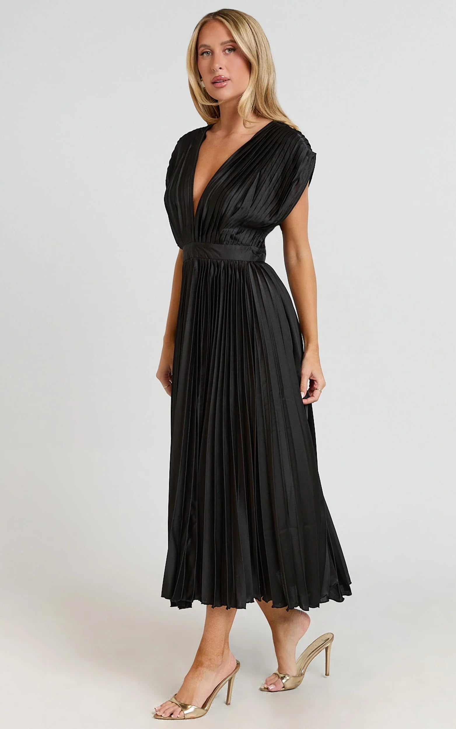 A deep V neckline, short sleeves and a swishy pleated skirt bring instant polish, while the cinched waist flatters every angle. The silhouette moves with you, from dinner to dance floor, serving that confident, camera-ready energy.