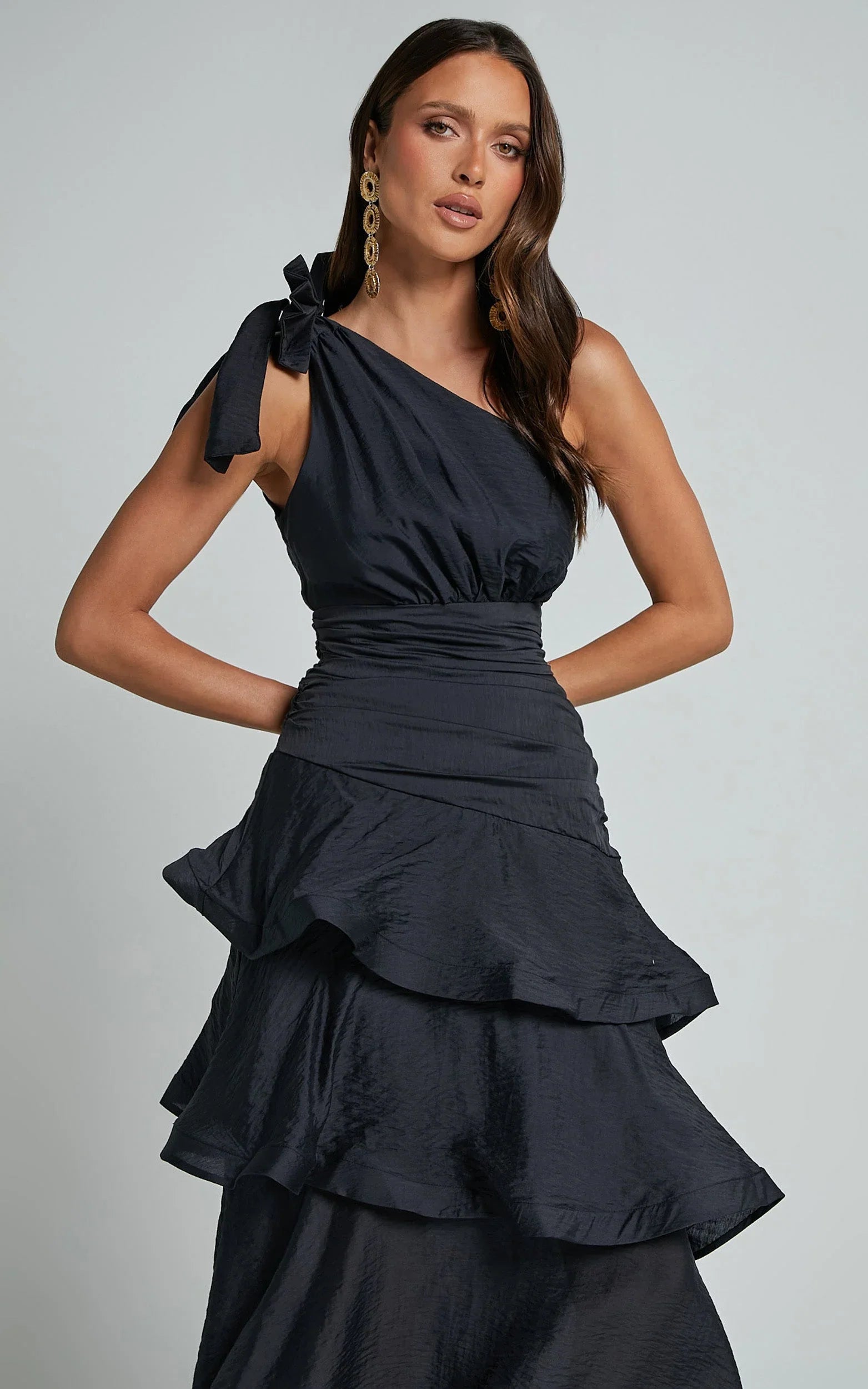 Make a statement in the Eugenia Midi Dress - One Shoulder Fit And Flare Layered Dress in Black. This dress is designed for the confident and fashion-forward woman who wants to stand out at any event. With its one-shoulder design and fit-and-flare silhouette, it flatters all body types and accentuates your curves in all the right places. Made from a blend of rayon and polyester, this dress is soft, breathable, and comfortable to wear all day long. Whether you're heading to a party or just want to make a statement during the day, this black midi dress will be your go-to choice. Shop now and embrace your unique style with Showpo!