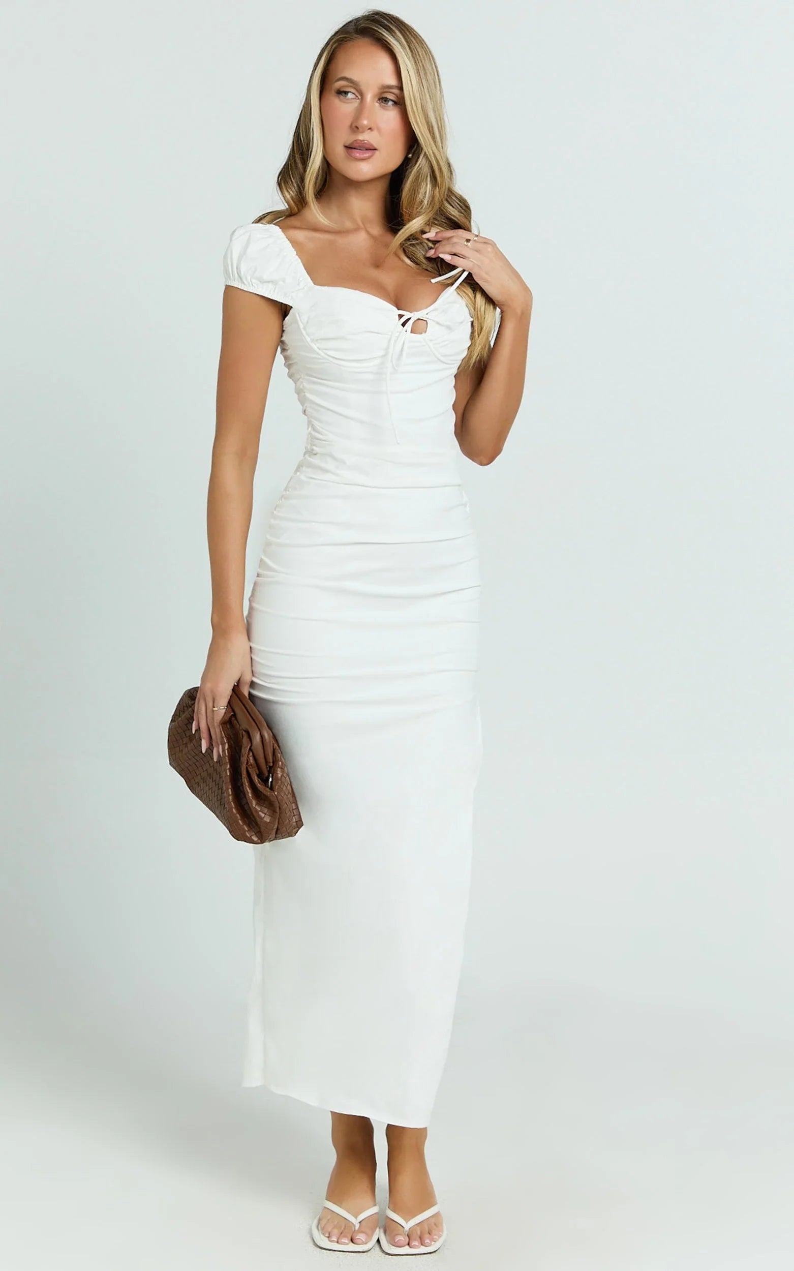 Featuring romantic cap sleeves and a flattering ruched bust that accentuates your figure, this fitted white dress perfectly blends timeless elegance with street-style charm. Whether you're searching for the ideal wedding guest dress or prepping for your next night out, its versatile midi length ensures you'll turn heads at any occasion.