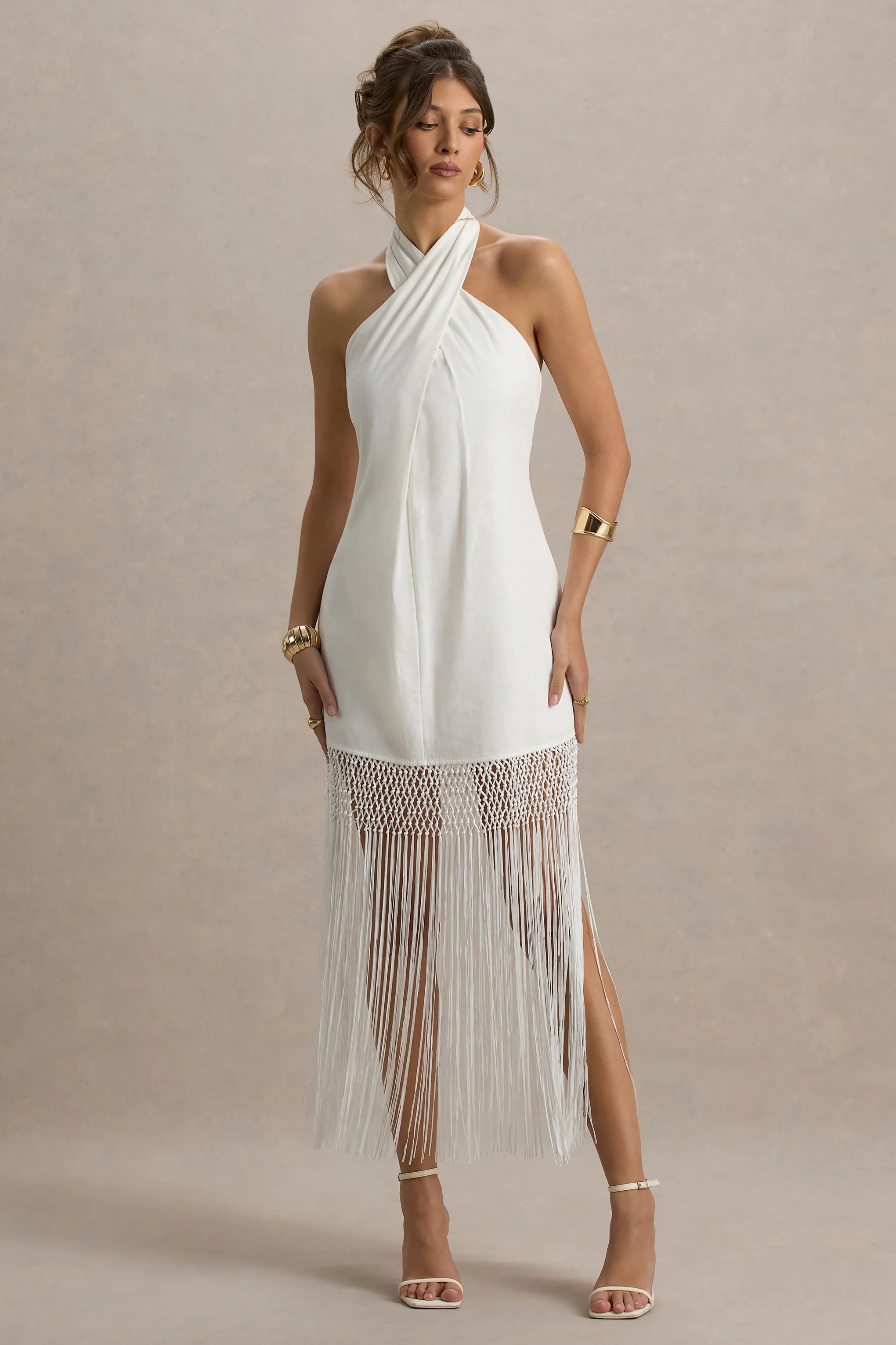 If you're after a look that's utterly effortless yet commands attention and turn heads, Fiametta will be your go-to. Designed in our premium linen for a lightweight finish, in a soft shade of ecru, this maxi is destined for endless summer nights. The halter neckline ,with a functional tie, adds a soft and delicate vibe which creates a stunning contrast to the intricate, beaded fringe skirt. From cocktails in Ibiza to dancing all night long at a festival, this maxi is the ultimate show stopping piece. Pair with gold accessories and be prepared to make an impression in every room.