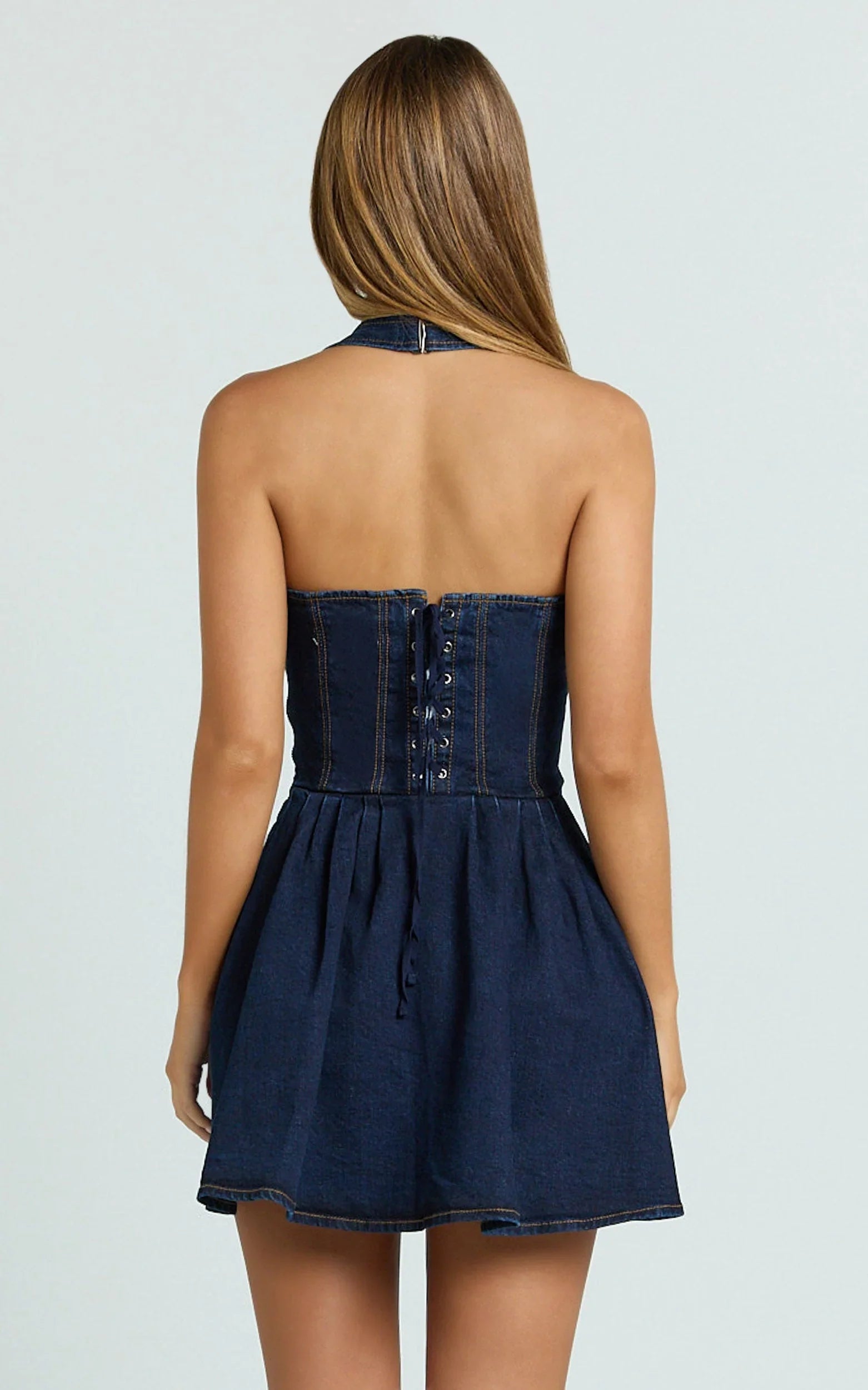 The corset-style bodice defines the waist while the deep blue hue brings a sleek, night‑out vibe to your Dresses rotation. Think dance-floor ready with a flirty hem that moves with you and a fit that flatters from every angle.