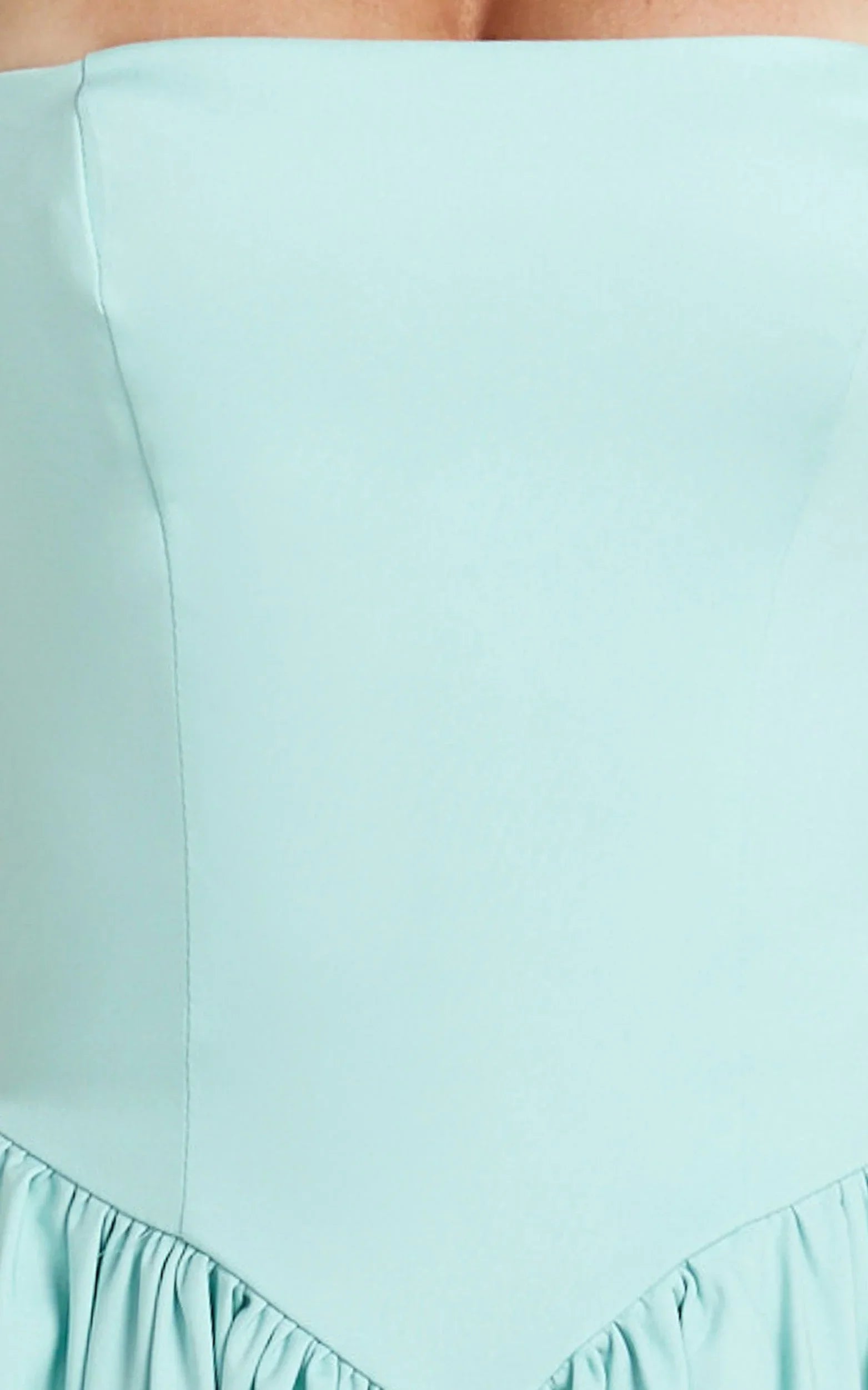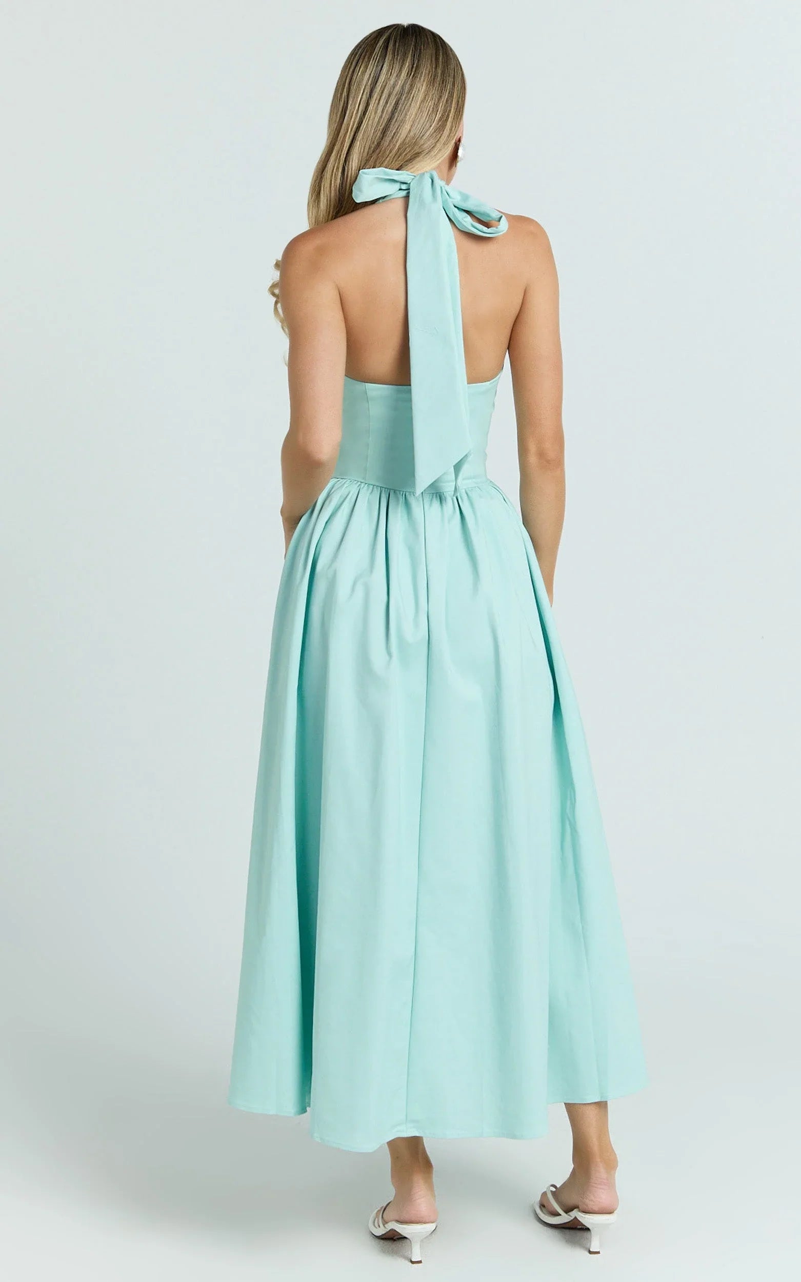 The Helda Midi Dress in Mint nails that polished-meets-playful vibe. The corset-style paneling pulls you in at the waist, while the flowy A-line skirt moves beautifully with you - elegant without feeling stiff. The halter neckline frames your shoulders, and the tie detail adds a soft, feminine finish that suits everything from long lunches to garden parties and dance floors. In that dreamy mint shade, Helda brings minimalist elegance with a touch of vintage romance. Style it with strappy heels and a dainty clutch for a refined moment, then add soft waves and dewy makeup for that picture-perfect glow. A must-have for dress lovers who want something special, wearable, and seriously flattering.