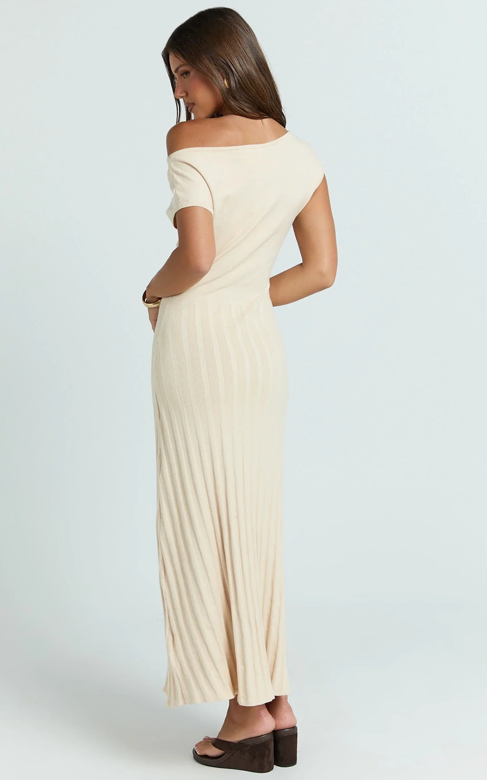 Sculpted with soft pleats that move with you, it flatters the waist and skims the silhouette, perfect for office days, long lunches, and dance-floor moments. Elevated yet effortless, this bone-toned beauty gives your Dresses edit a fresh neutral that plays well with everything.