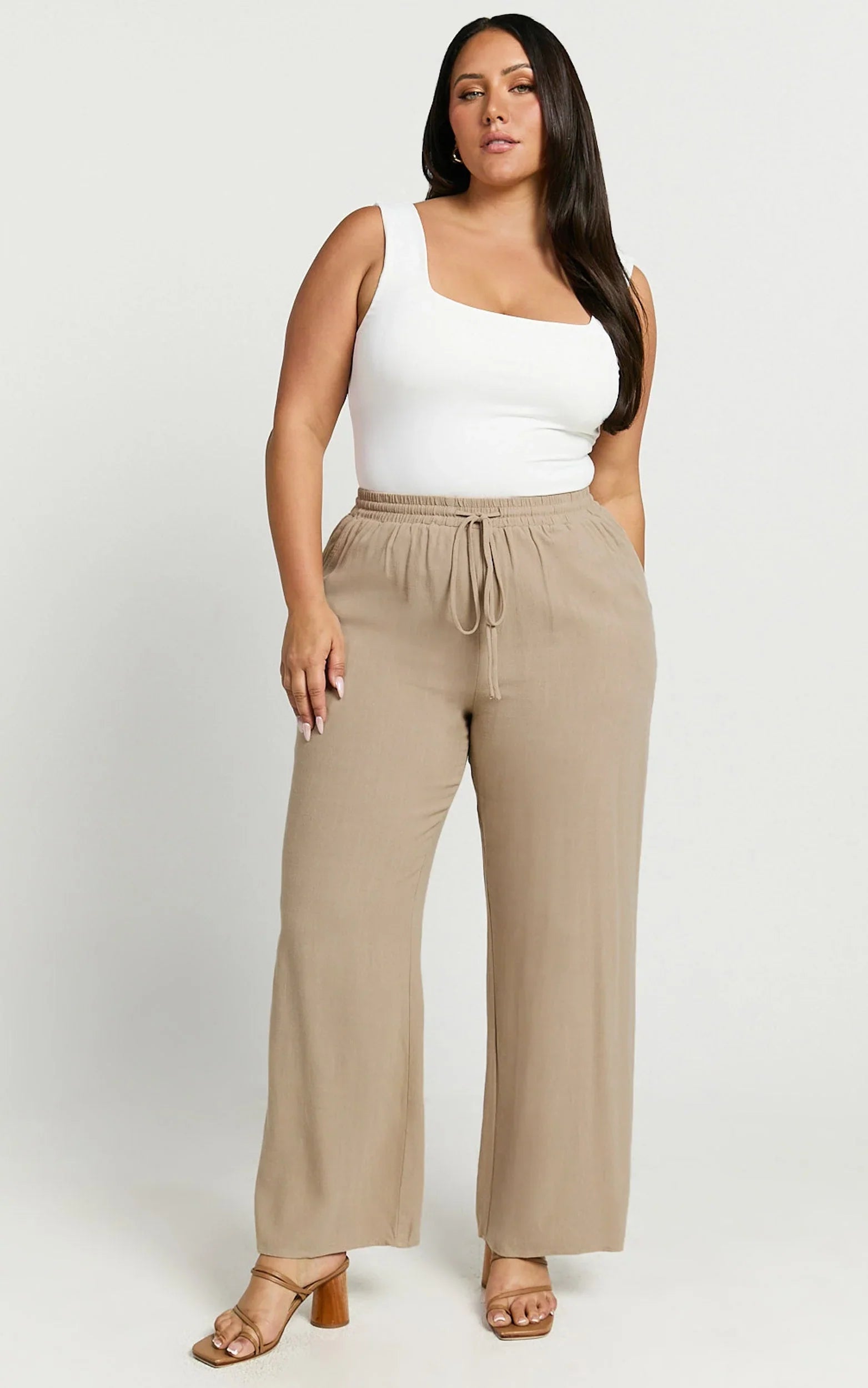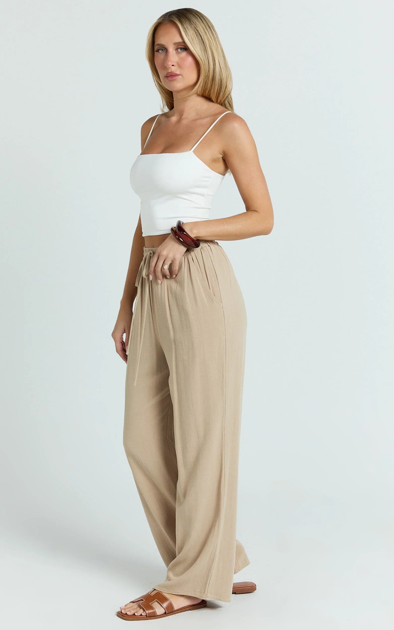 Designed with a mid-waist fit in a relaxed sand tone, these pants are perfect for mastering that minimalist look everyone's loving. Their elasticated waistband offers ease and a flattering shape, ready to take you comfortably from casual street-style strolls straight to brunch dates.