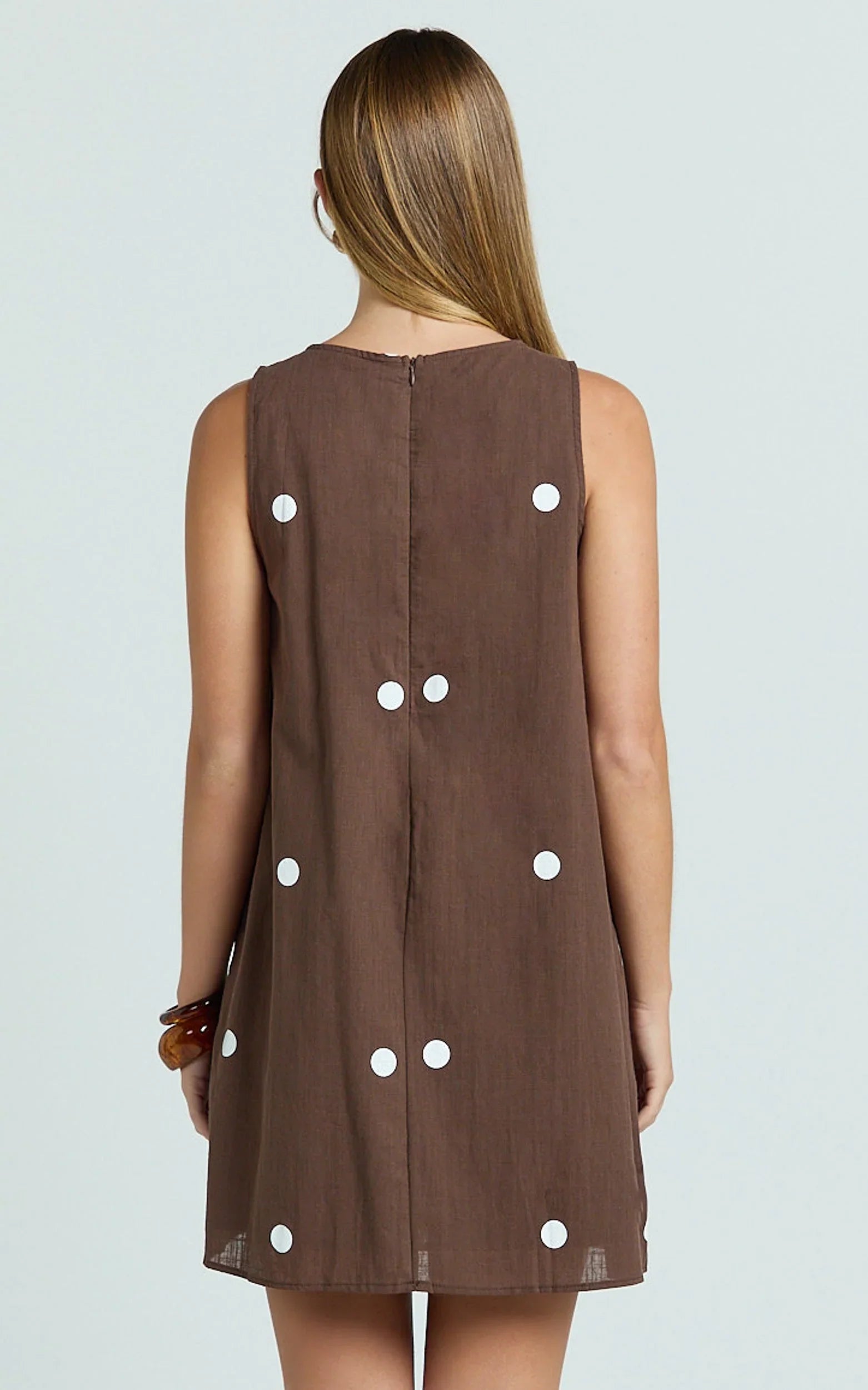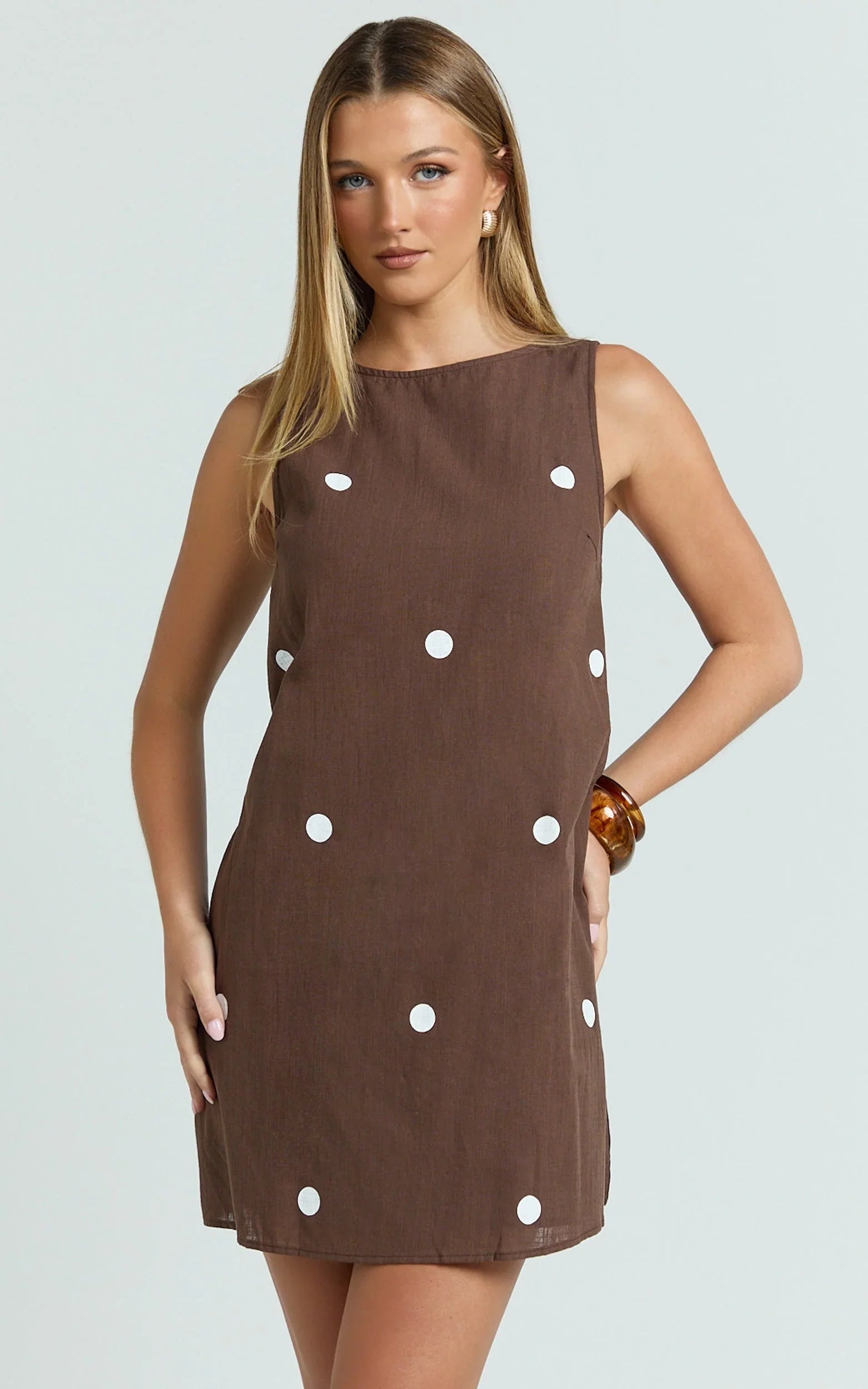The Kate Mini Dress in Chocolate Polka Dot keeps it flirty yet polished with a relaxed shift silhouette and rich chocolate polka dot print. It skims just right for an easy, throw-on outfit made for casual dates, desk-to-dinner plans, and weekend play. Effortless and confidence-boosting, it moves with you from sunrise lattes to sunset cocktails. Style Kate with minimal gold hoops, a sleek shoulder bag, and classic sneakers for a fresh spin, or lean dressy with sheer socks and ballet flats. Simple, versatile, and ready for repeat wear, this mini is your shortcut to instant polish.