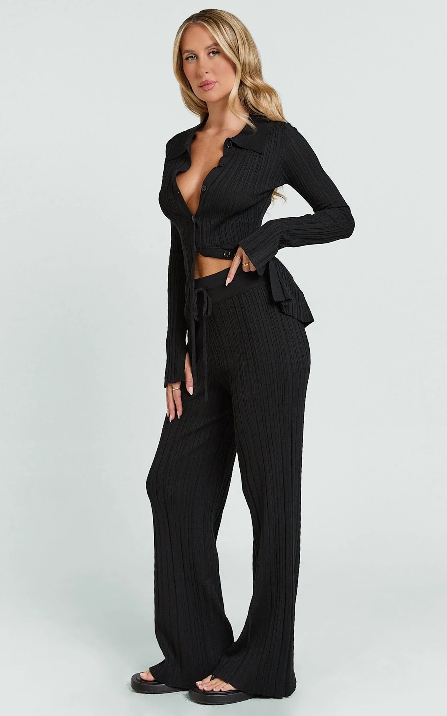 These Black pants cinch comfortably with a drawstring waist, creating an elongated silhouette that flatters and flexes from coffee catch-ups to late-night plans. Clean lines keep it polished while the relaxed leg gives that laidback luxe vibe, think desk-to-dinner without the outfit change.