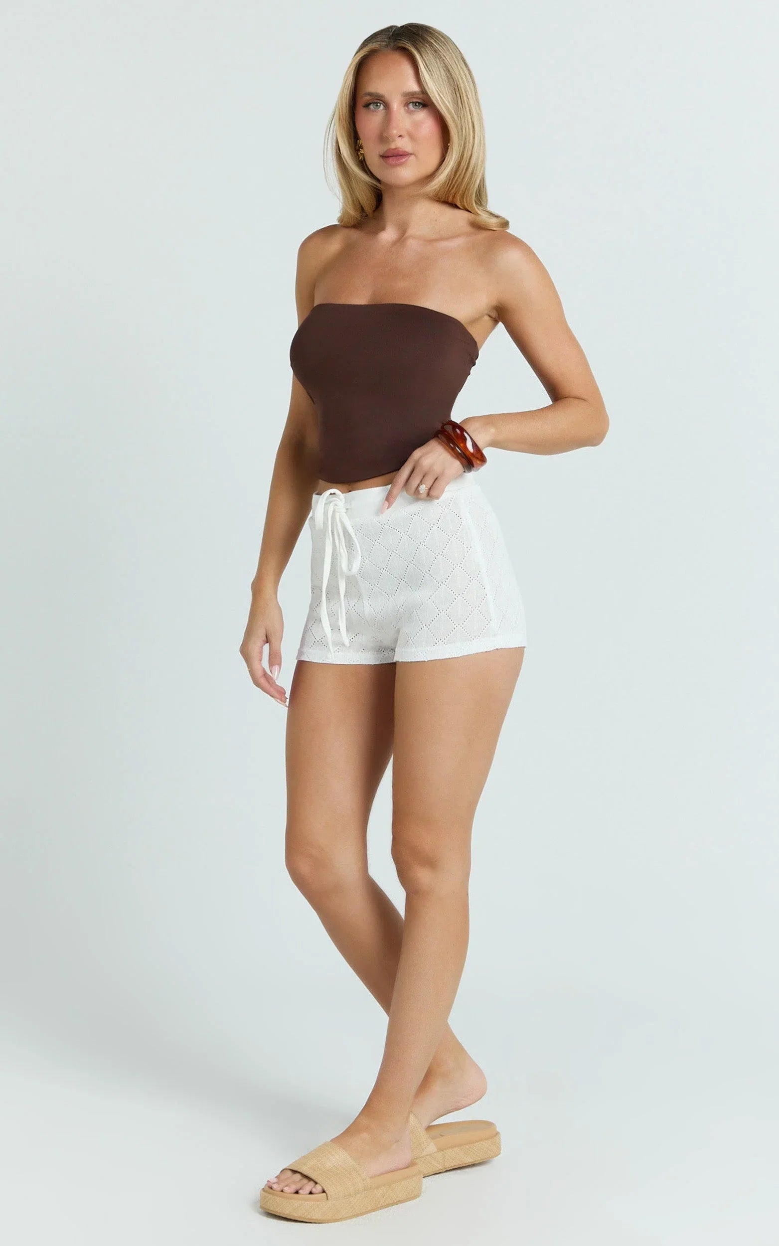 The Laurel Shorts in Off White bring that textured-but-effortless vibe your wardrobe’s been waiting for. The off-white hue keeps things minimalist and easy to style, while the comfy drawstring waist and cheeky mini cut add a fun, flirty edge. Pair them with a fitted crop and strappy sandals for an easy weekend fit, or layer with an oversized button-up for a relaxed boho moment. Laurel Shorts are your go-to when denim feels too basic, but you still want something wearable. Dress them up with a sleek bodysuit and layered gold jewellery, or keep it laid-back with a simple tee and slides. From beach days to festival plans, these crochet shorts nail that chic-meets-playful energy every time.