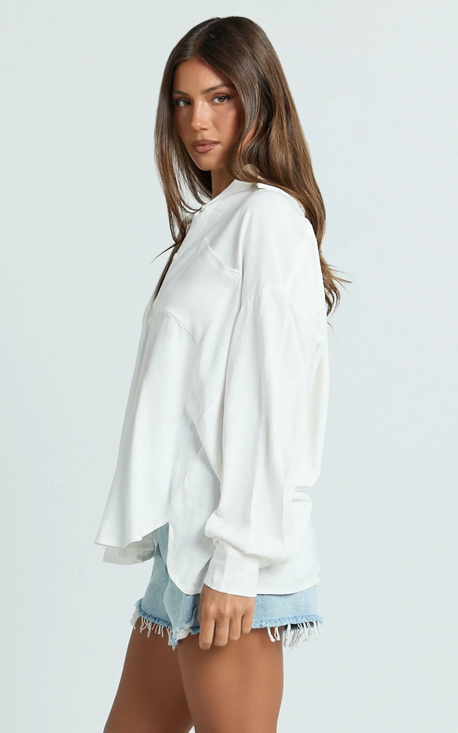 The Leanne Top in White is that classic white shirt you’ll wear a million ways. It has a relaxed drape and easy button-down fit that feels effortless but still looks put together. Polished without trying too hard. The lightweight linen blend makes it breezy enough for warm days but still sharp enough for work, brunch, or throw-on styling. Tuck it into tailored pants for a clean office look, tie it at the waist with denim cut-offs for weekends, or wear it open over a tank for a chilled, layered moment. Roll the sleeves, add gold hoops and your favourite bag, and you’re done. A forever piece with endless outfit potential - Leanne is that wardrobe staple you’ll reach for on repeat.
