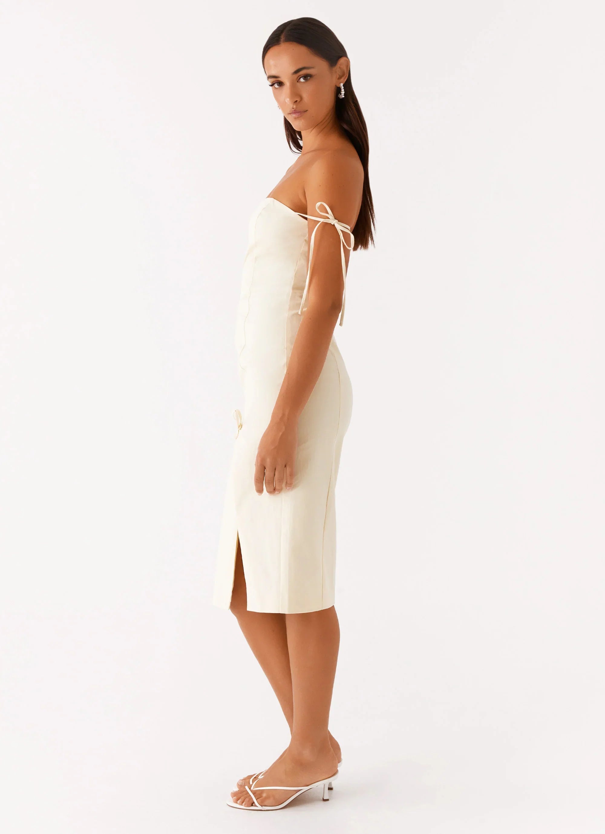 Shine bright in the Limelight Midi Dress, featuring innovative silicone taping for a secure fit that flatters your figure. The stylish shoulder ties add a playful touch, while the back invisible zipper ensures easy wear without compromising the sleek design.