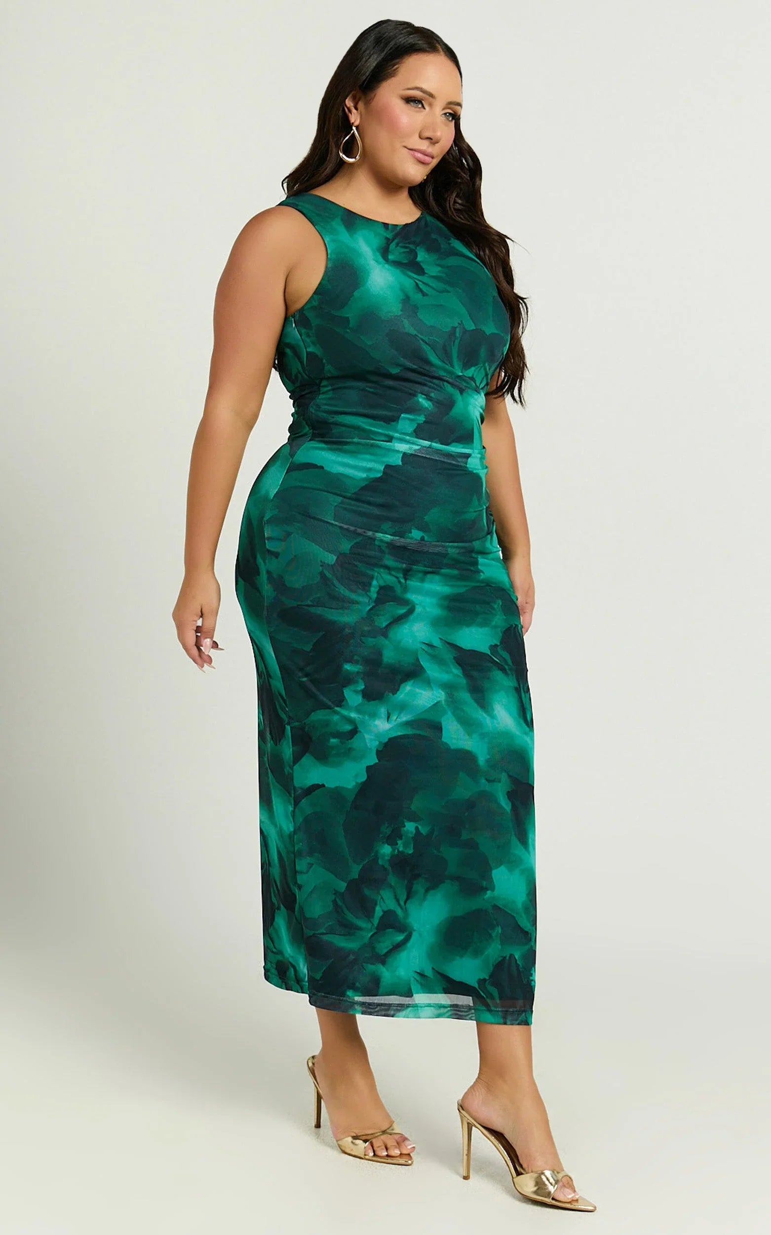 The Loralie Midi Dress in Green Floral Print brings a high-neck mesh bodice and a curve-skimming silhouette that turns heads with zero effort. The bold floral finish brings fresh colour play, while the smooth bodycon fit contours through the waist and hips for a confident, night-out-ready feel. Style it with chunky gold earrings and simple black slingbacks for a sleek evening moment, or throw on a cropped leather jacket and ankle boots for an edgier take. Add a tiny top-handle bag, and you’re set, clean, cool, and undeniably chic.