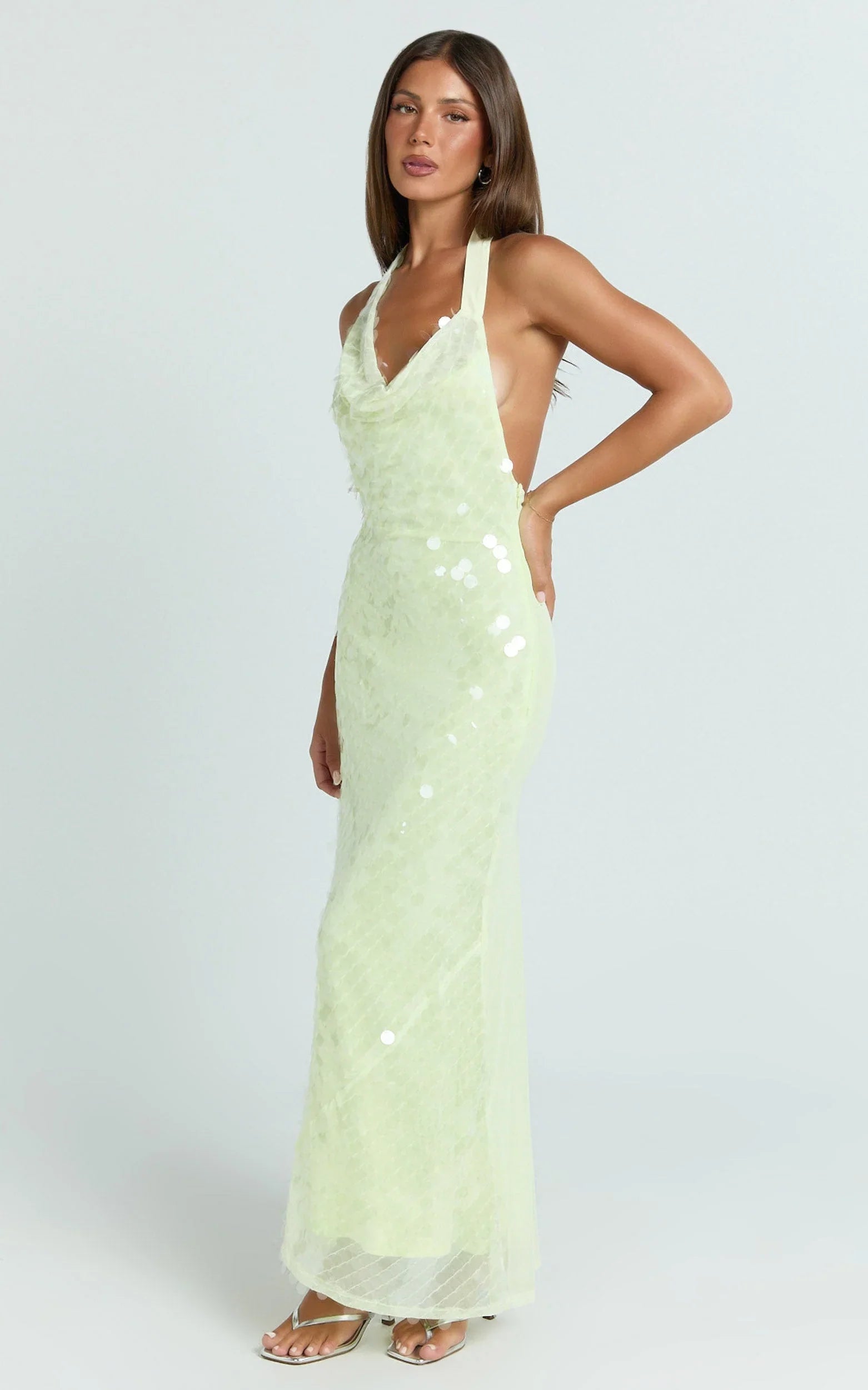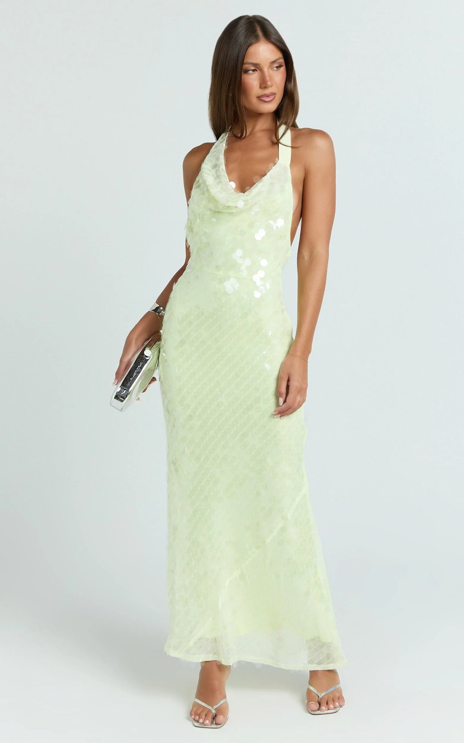 The Lucy Maxi Dress in Citrus is all about fluid drape and effortless glow. The floor-grazing silhouette keeps it sleek and chic, while the sequin finish catches the light from every angle, minimalist lines, maximum impact. Perfect for weddings, formals, and after-dark plans, this citrus showstopper was made to own the room. Featuring a flattering open back and elongated silhouette, it pairs beautifully with strappy heels and a compact clutch. Add delicate earrings and a soft glam lip to keep the monochrome mood polished, she’s the statement, you’re the main character.