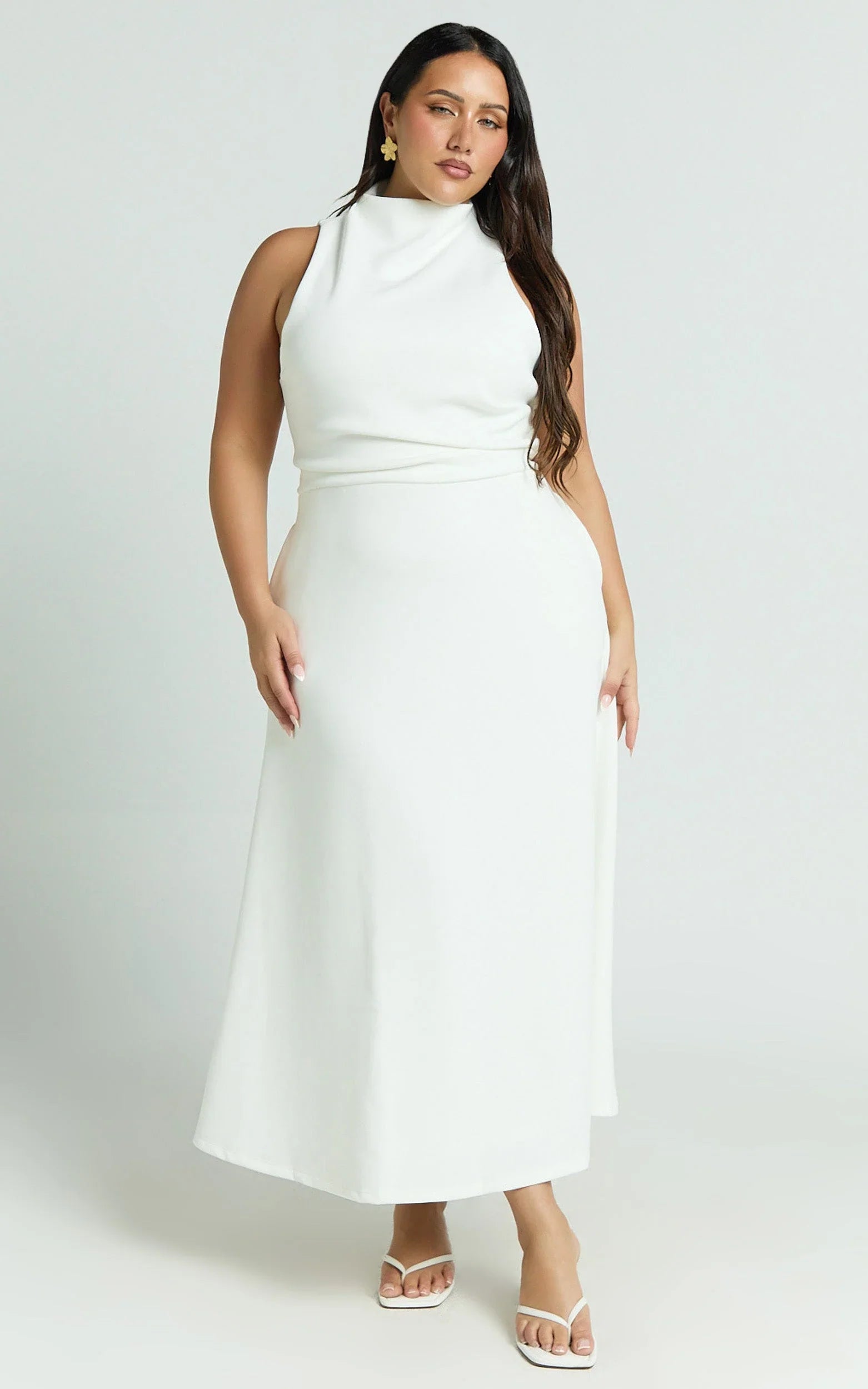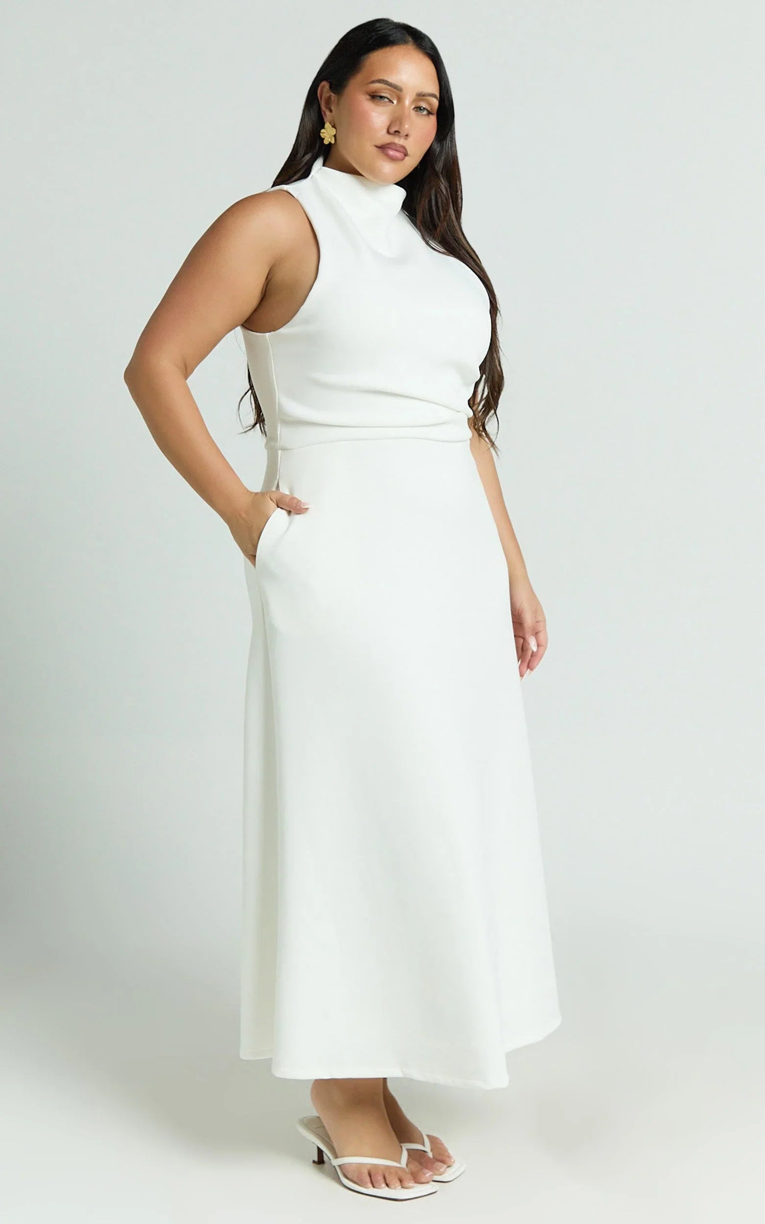 The Macy Midi Dress in Off White brings a clean, high-neck silhouette with flowy movement that feels polished and easy, making it an instant yes for bridal events, long lunches, and date nights. The soft A-line shape keeps things refined while giving you room to move, and the off-white tone is a fresh, timeless base for your styling. Macy finishes mid-calf to elongate the legs and create an elegant line. Style it with minimalist sandals and metallic sunglasses for a sleek daytime look, or switch to mesh flats or sneakers for a cool-girl twist. Add delicate jewellery and a chic clutch after dark. The styling makes sense, just simplified here to keep it clean and modern. Chic, crisp, and so camera-ready, this piece is one you’ll reach for again and again.
