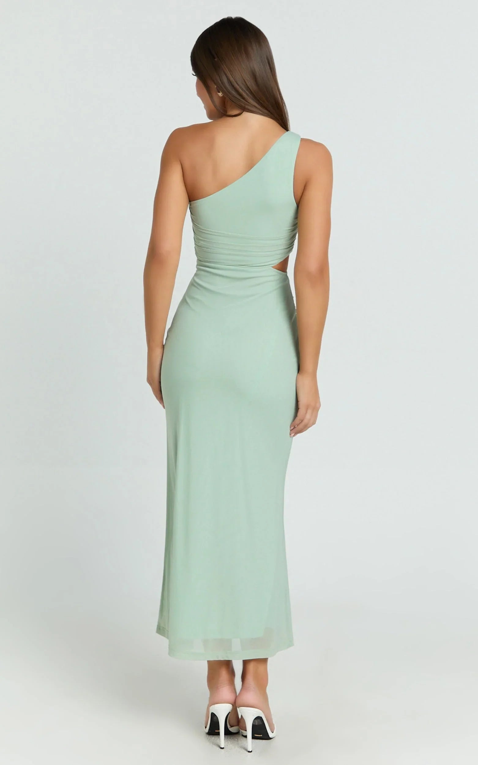 The Mandy Midi Dress - Knot Detail Cut Out Mesh Dress In Sage delivers minimalist lines with maximum impact, Versatile enough to style up with strappy heels and sleek jewellery or keep it low-key with barely-there sandals. Part of our Dresses edit, it’s made to flatter, photograph beautifully, and own the night.