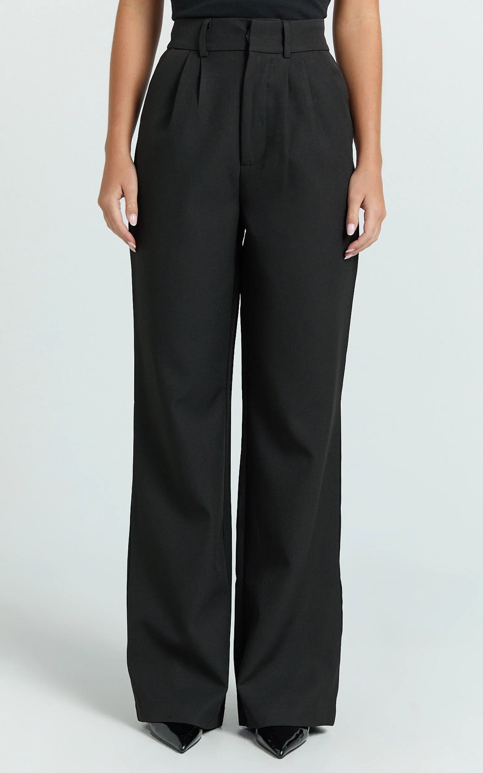 The Melissa Pants are sleek, refined, and endlessly wearable. With a clean high waist and fluid wide leg, they create that elongating, tailored silhouette that moves from desk to drinks with zero effort. The soft pleat detail adds structure while keeping things relaxed - think modern suiting vibes with a feminine edge. Style them with a fitted top, pendant necklaces, and strappy heels for after-dark polish, or keep it casual with sleek flats for everyday chic. The classic black hue pairs perfectly with crisp shirting or a slinky cami, making these your new go-to tailored pants for any occasion. Effortless, flattering, and totally timeless.