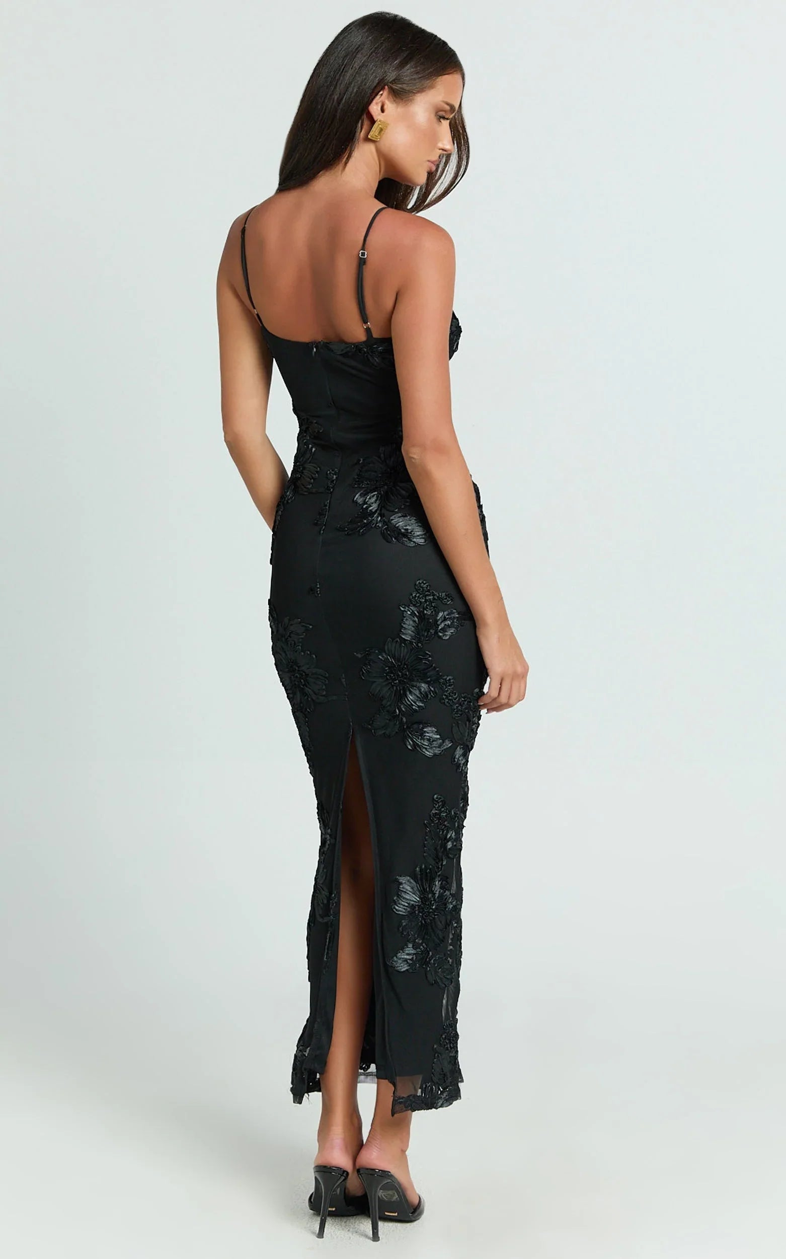 Transform your look with the Mina Midi Dress, a masterpiece of style that defines sophistication and empowerment. This beautifully crafted embroidered mesh dress in classic black is your ultimate companion for those moments when you want to make a lasting impression. Whether you're stepping out as a wedding guest, attending a formal event, or simply elevating your everyday elegance, the Mina Midi Dress is designed to celebrate you.