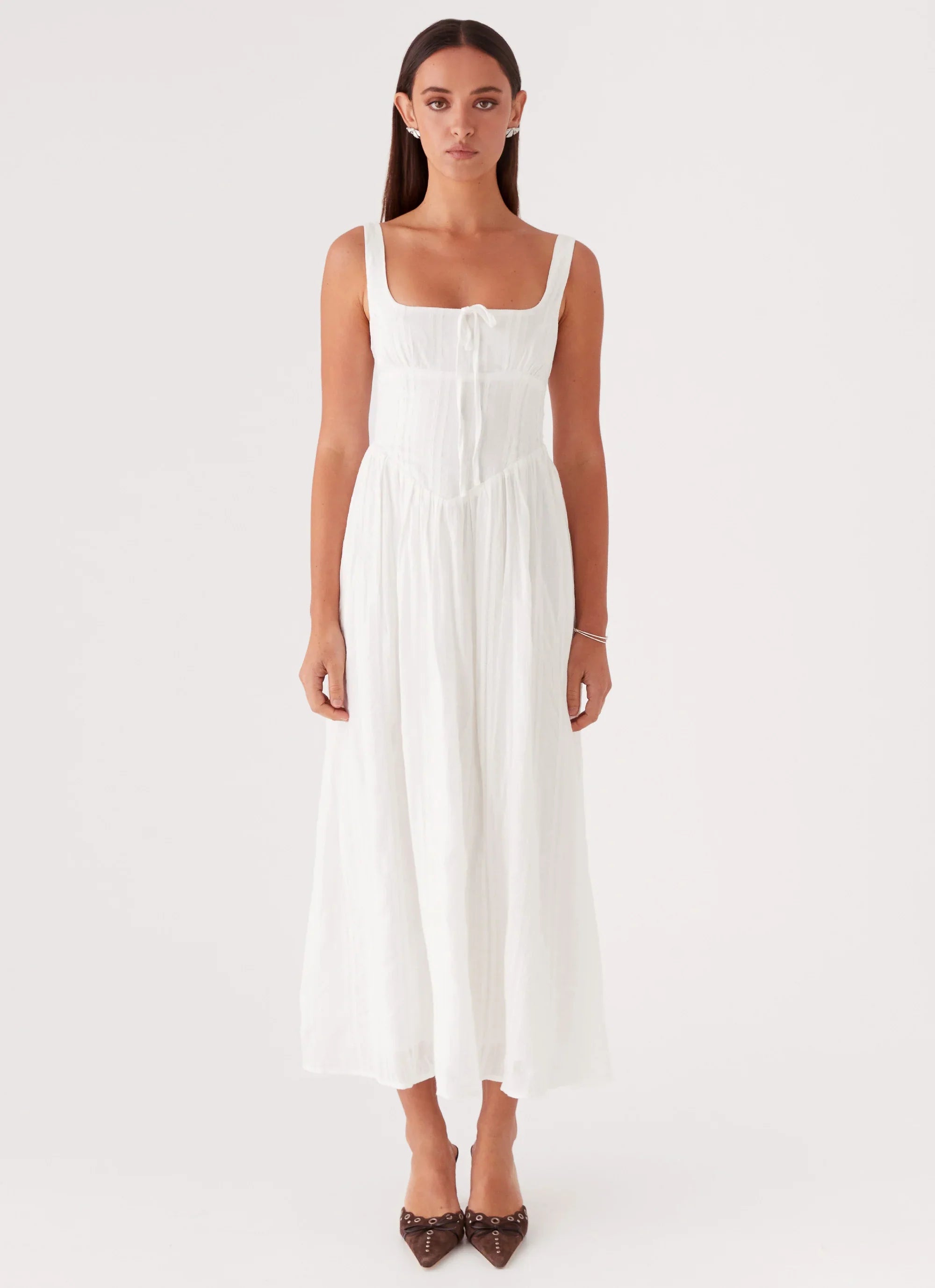 Introducing the Pascuelle Midi Dress. With its square neckline and front bust tie, this dress exudes sophistication, framing your silhouette with grace.