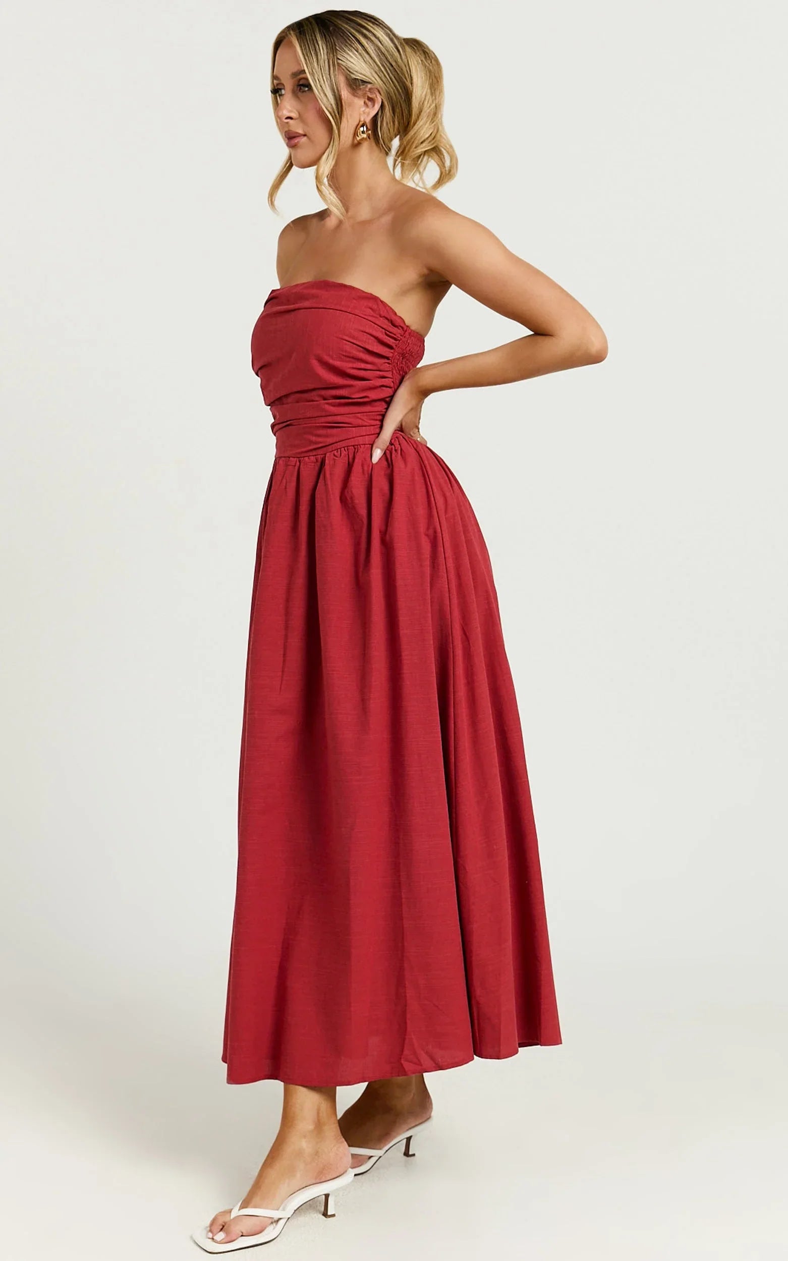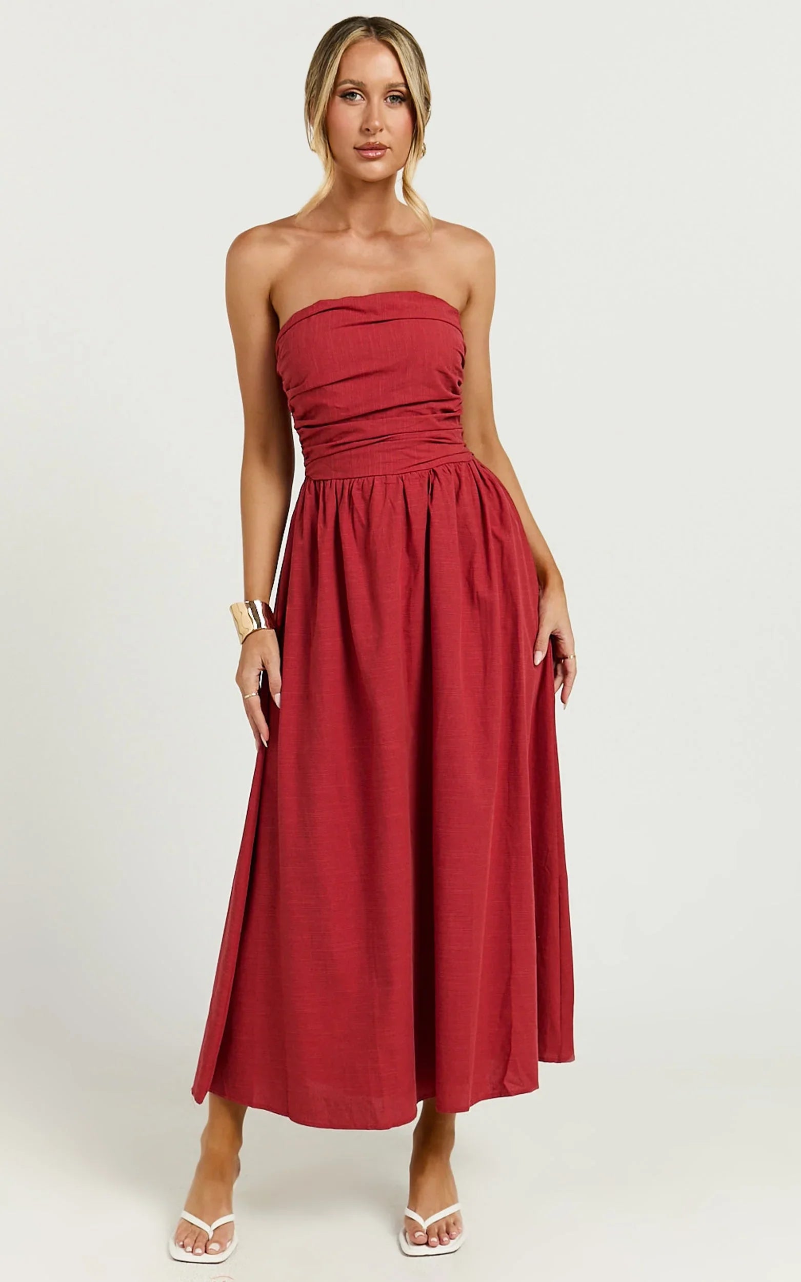 Introducing the unforgettable Polly Midi Dress - a strapless ruched masterpiece in a vibrant red that's made to turn heads and empower your stride. This stunning dress isn’t just a piece of clothing; it's a statement of confidence, a celebration of your bold and beautiful self. Perfect for any occasion, from daytime outings to evening escapades, it's versatility personified.