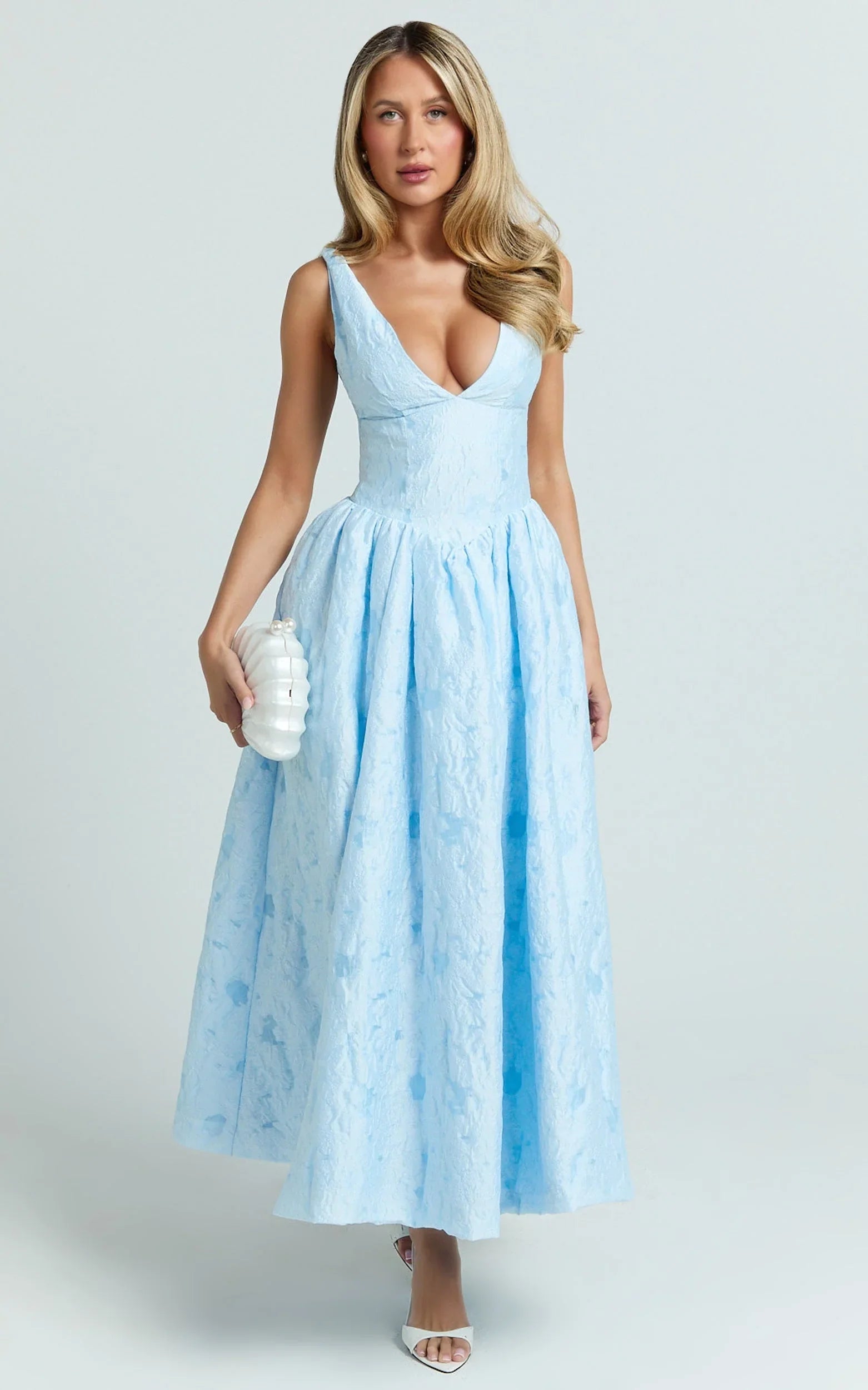 The Posie Midi Dress brings a playful spin to quiet luxury with its romantic jacquard detailing and modern heirlooms-inspired silhouette, think timeless elegance with a trend-driven edge. Fitted through the bodice then flaring below the waist, it flatters your shape while giving you room to twirl.