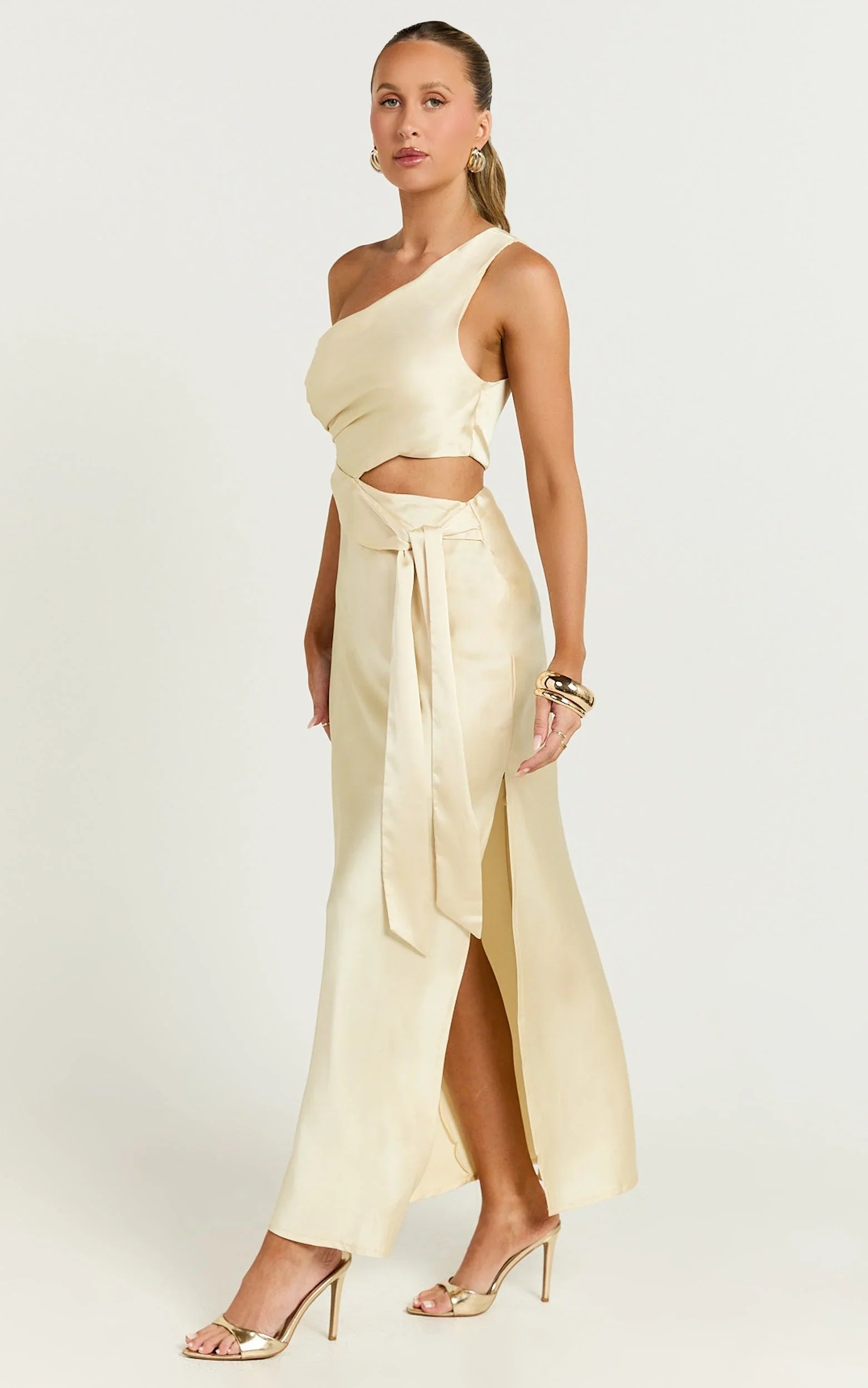 Embrace your radiance and step into style with our stunning Regina Midi Dress! This one-of-a-kind piece, featuring an eye-catching one-shoulder cut-out side detail, is designed to make a statement and elevate your wardrobe. Dipped in a gorgeous butter yellow, this dress embodies the warmth and vibrancy of summer. Its luxurious satin finish, crafted from high-quality polyester, glides smoothly against your skin, offering both comfort and elegance.