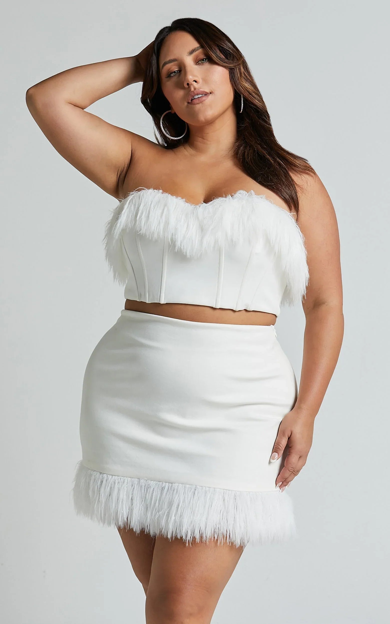 The mini of the season. Slay the party dress code with the Rhaiza Skirt! This stylish mini features a high rise waist, A-line silhouette and faux feather trim detail at the hem. It's a cute piece that can be worn across various events or occasions.