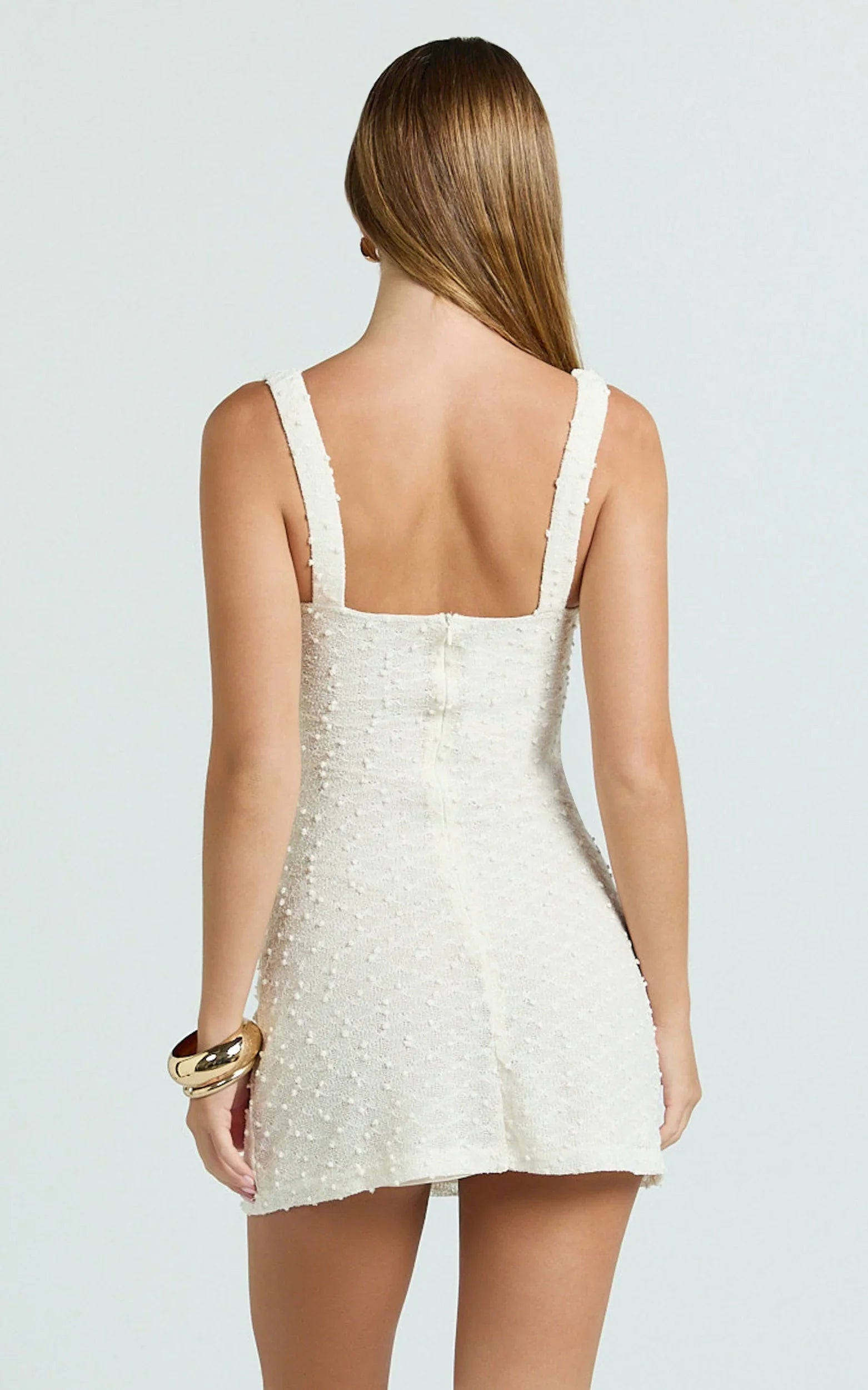 This ivory mini is all about the cut-out waist, gold trim and A-line sway that flatters and moves. Think Summer whites energy in a silhouette made for rooftops to registry dinners, polished yet playful so you can float from day plans to date nights without a wardrobe change.
