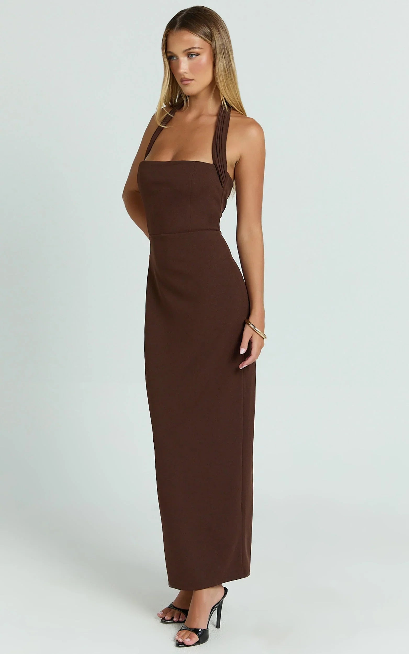 This halter neck column silhouette skims and elongates for an effortlessly polished vibe, perfect for date nights, weddings or cocktail hour. A rich brown tone keeps it elevated while the open back and ties add a little drama. Style this midi with mesh flats or jelly sandals for a cool-girl edge and tap into the moment with subtle rosettes or a butter yellow accessory for contrast.